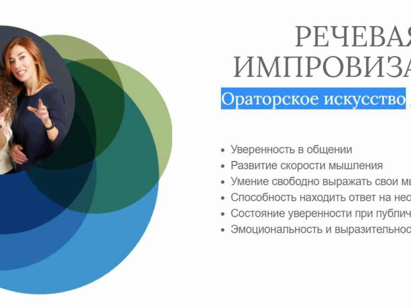 Речевая импровизация - это умение красиво и увлекательно говорить на любую тему. Вы сможете легко поддержать любую беседу, чувствовать себя уверенно с новыми людьми - в повседневной жизни, на переговорах, во время выступления.