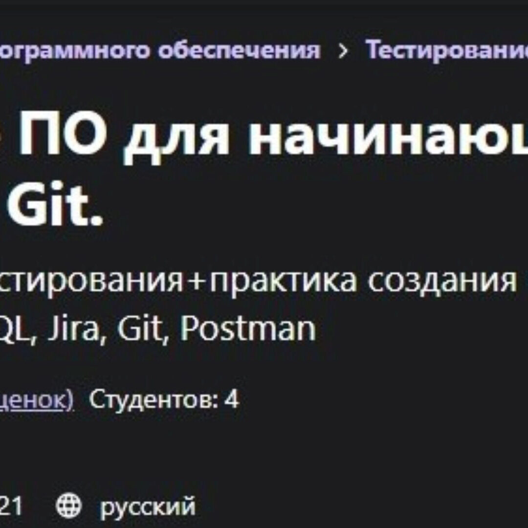 Если вы хотите начать работать в IT, сменить свою сферу деятельности, но не знаете, с чего начать, подтянуть свои знания по тестированию или просто интересуетесь сферой IT, то этот курс для Вас! В курсе будет рассмотрена теория тестирования, техники тест - дизайна, но безо всякой лишней воды, только то, что действительно пригодится при собеседовании и в работе. В курсе рассмотрены основные инструменты, с которыми работает тестировщик, а именно: SQL запросы, баг - трекинговая система Jira, тестирование API c помощью Postman, система контроля версий Git, тестовые артефакты: чек - листы, тест - кейсы, баг - репорты. Работая в тестировании, Вы независимы от своего рабочего места, работать можно удаленно из любой точки земного шара! Сфера тестирования ПО очень быстро растет, тестированию подвергаются любое программное обеспечение, система, приложение или web - сайт, вакансий в этой области больше, чем соискателей, уровень зарплат в IT выше, чем в других отраслях. Средний заработок тестировщика 500-2500 $. На курсе рассматриваются вопросы, которые задают на собеседованиях на позицию тестировщика ПО. Пройдя этот курс, вы сможете пройти собеседование на позицию Junior тестировщика. Главное - верить в себя, в свои силы, двигаться к своей цели, прилагать усилия и у Вас обязательно все получится! По любым вопросам обращайтесь, пожалуйста, в личные сообщения и я буду рад помочь ответить на возникающие вопросы.