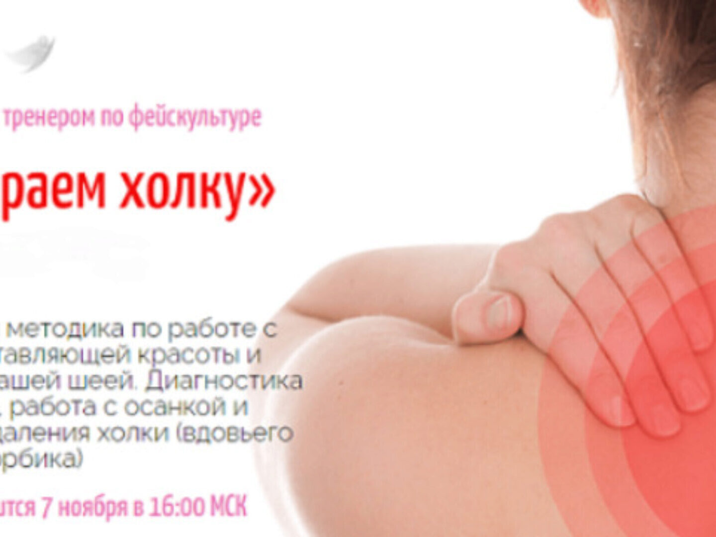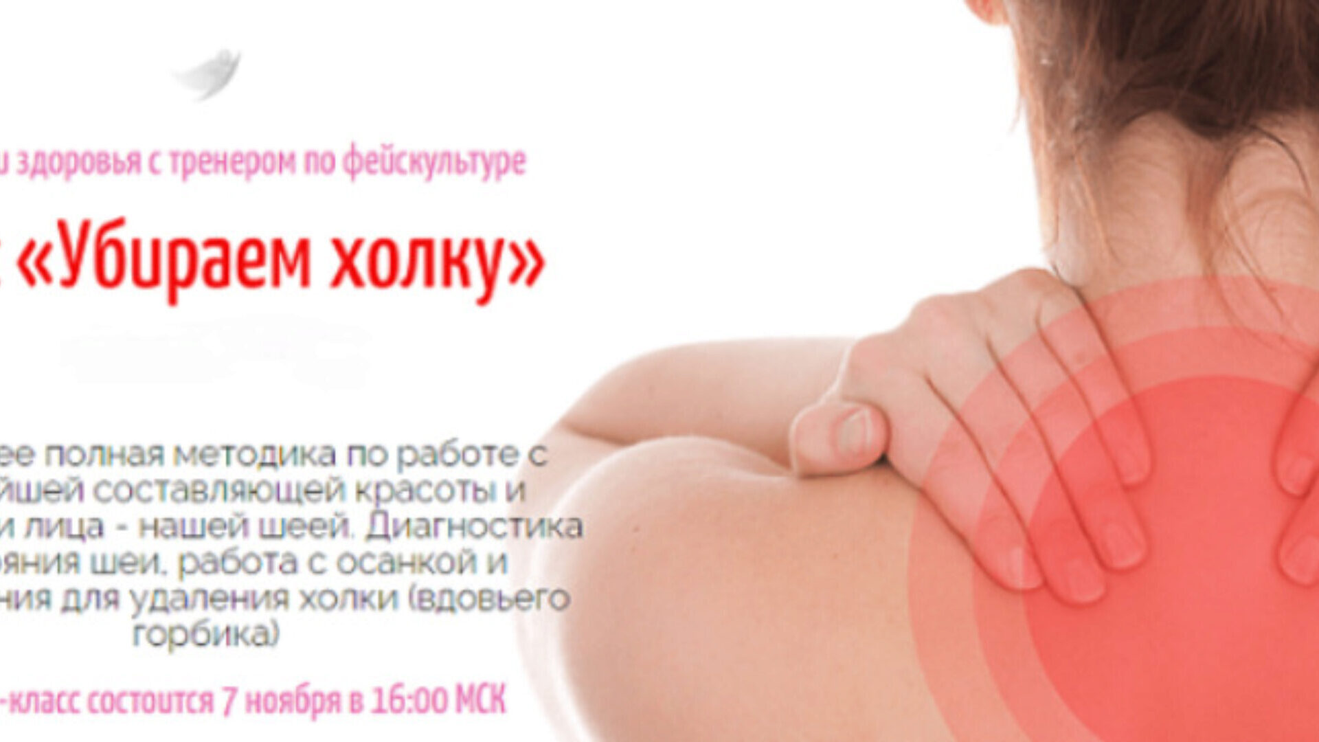 КАК УСТРАНИТЬ «ХОЛКУ» И ВЕРНУТЬ ЛИЦУ КРАСИВЫЙ УГОЛ МОЛОДОСТИ Дата и время проведения: СЕГОДНЯ, 20 декабря, в 21-30 по Москве. Вас ждет практический онлайн интенсив, на котором мы разучим техники глубокотканного массажа, направленные на устранение спаечных процессов в таких областях как «холка»
