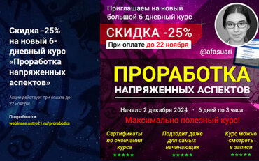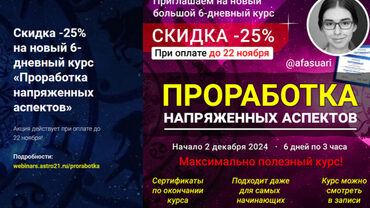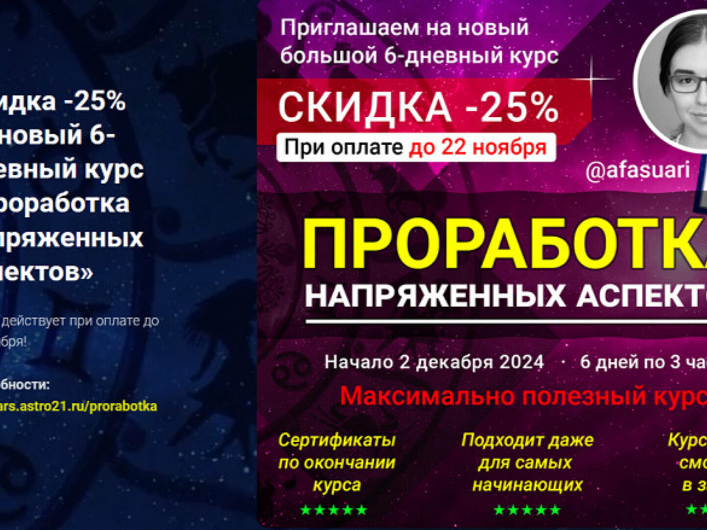 Этот большой 6-дневный курс раскроет вам секреты работы с напряженными аспектами и поможет превратить сложные стороны вашей натальной карты в источник силы и роста