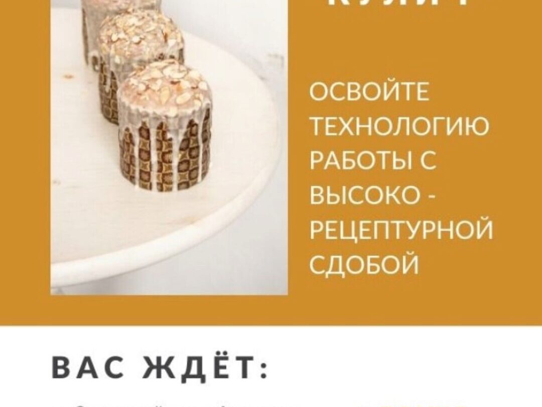 Благодаря тому, что вы обучаетесь не конкретному рецепту кулича, а технологии работы с высокорецептурной сдобой, после курса вы сможете легко трансформировать полученные знания в любой рецепт вкуснейшей выпечки. На столе появятся куличи, панетонне, ромовые бабы, пышные булочки и нежные кексы.