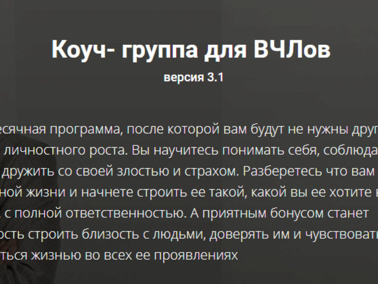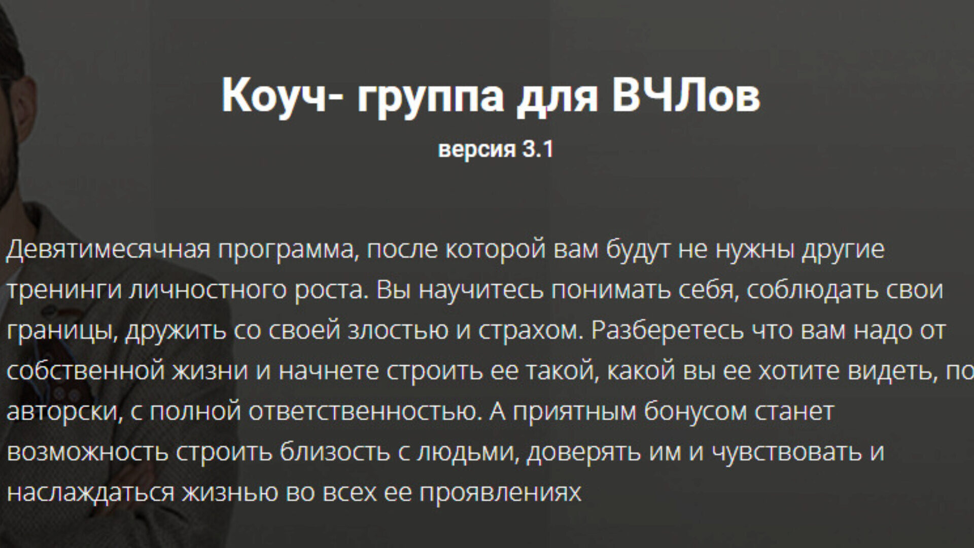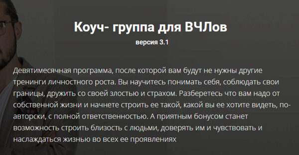 - Вы «ветеран личностного и духовного роста» и прошли большое количество тренингов, в поиске улучшения качества своей жизни. После этой программы вы перестанете ходить по тренингам. Потому как найдете, наконец, ответы на свои вопросы.