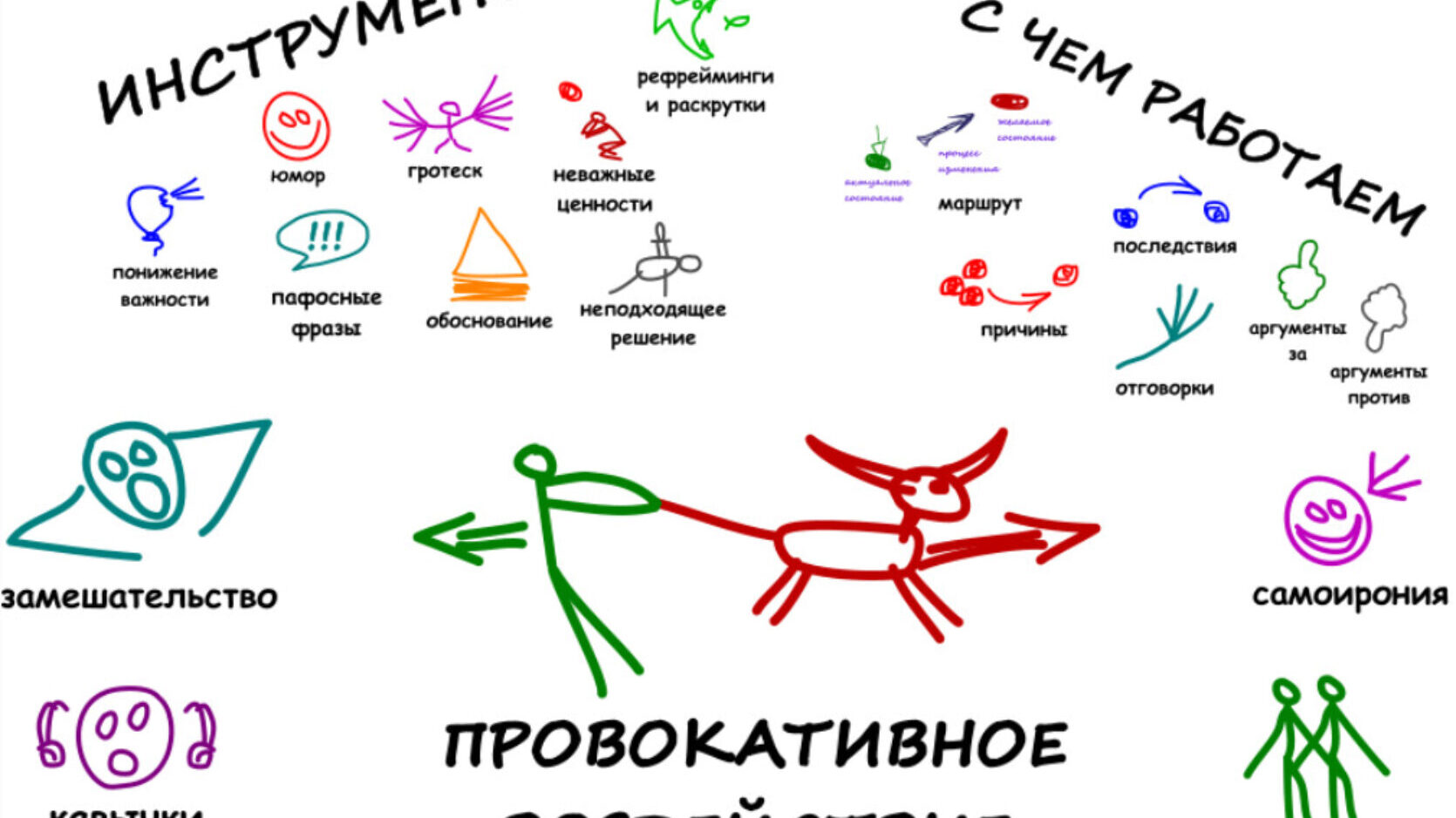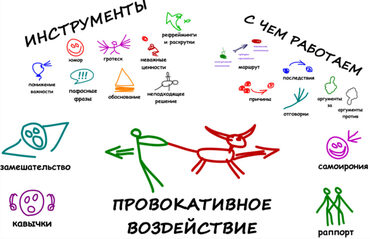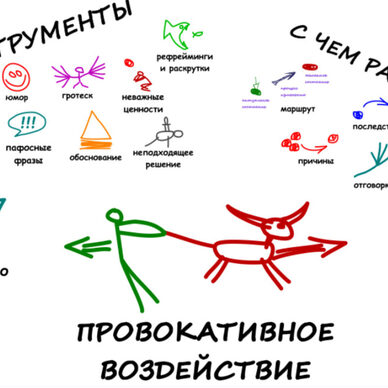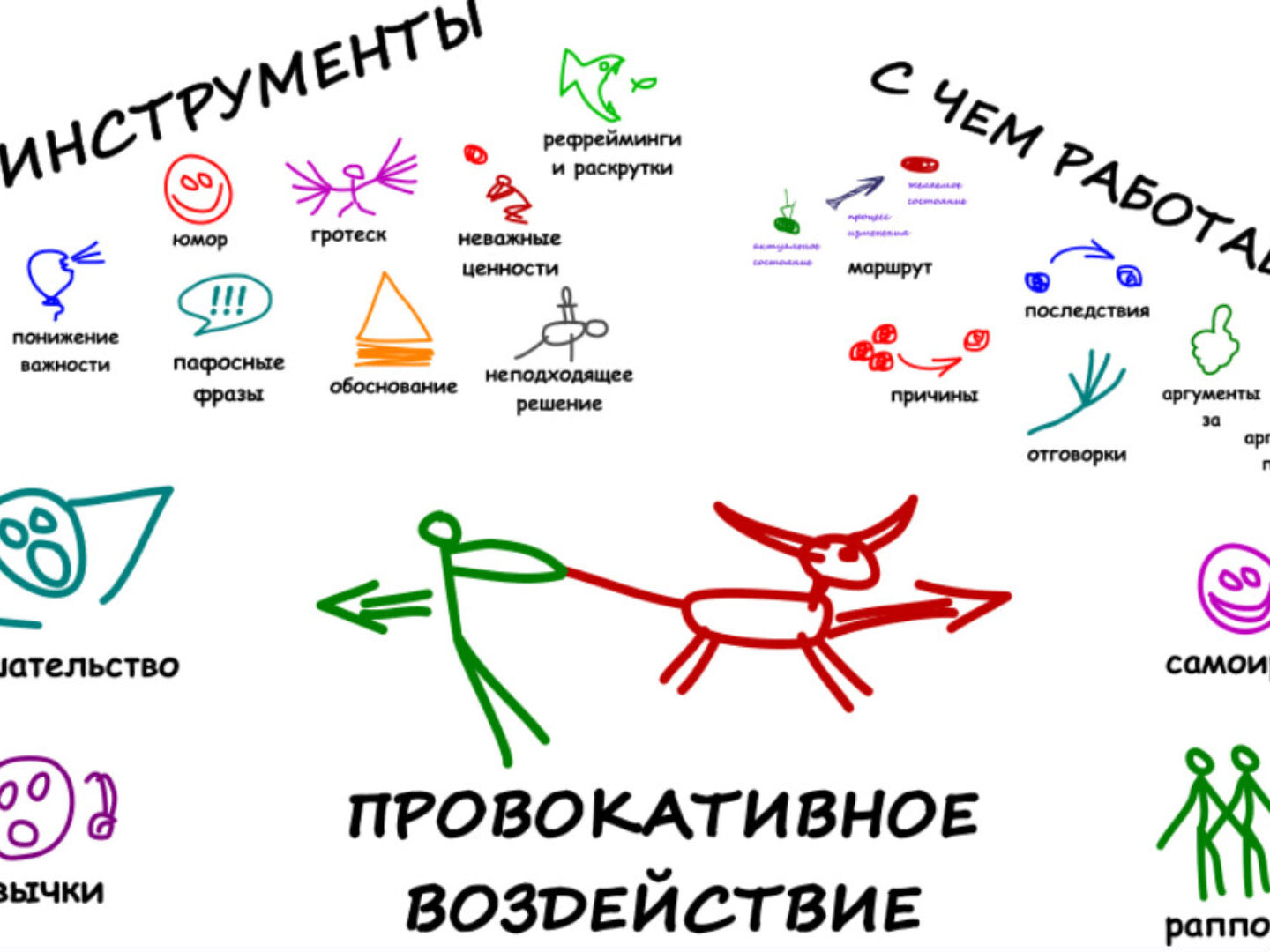 Очень условно варианты воздействия можно разделить на «прямые» и «провокативные». При «прямом» воздействии мы направляем человека - тянем быка за уздечку (или что там на быков навешивают), при «провокативном» вызываем сопротивление так, чтобы человек двигался в нужную сторону - как Милтон Эриксон, когда тянул быка за хвост. Провокативный способ воздействие во многих случаях может быть весьма полезен - вместо того, чтобы уговаривать и мотивировать Клиента, вы провоцируете его и он сам начинает мотивировать себя.