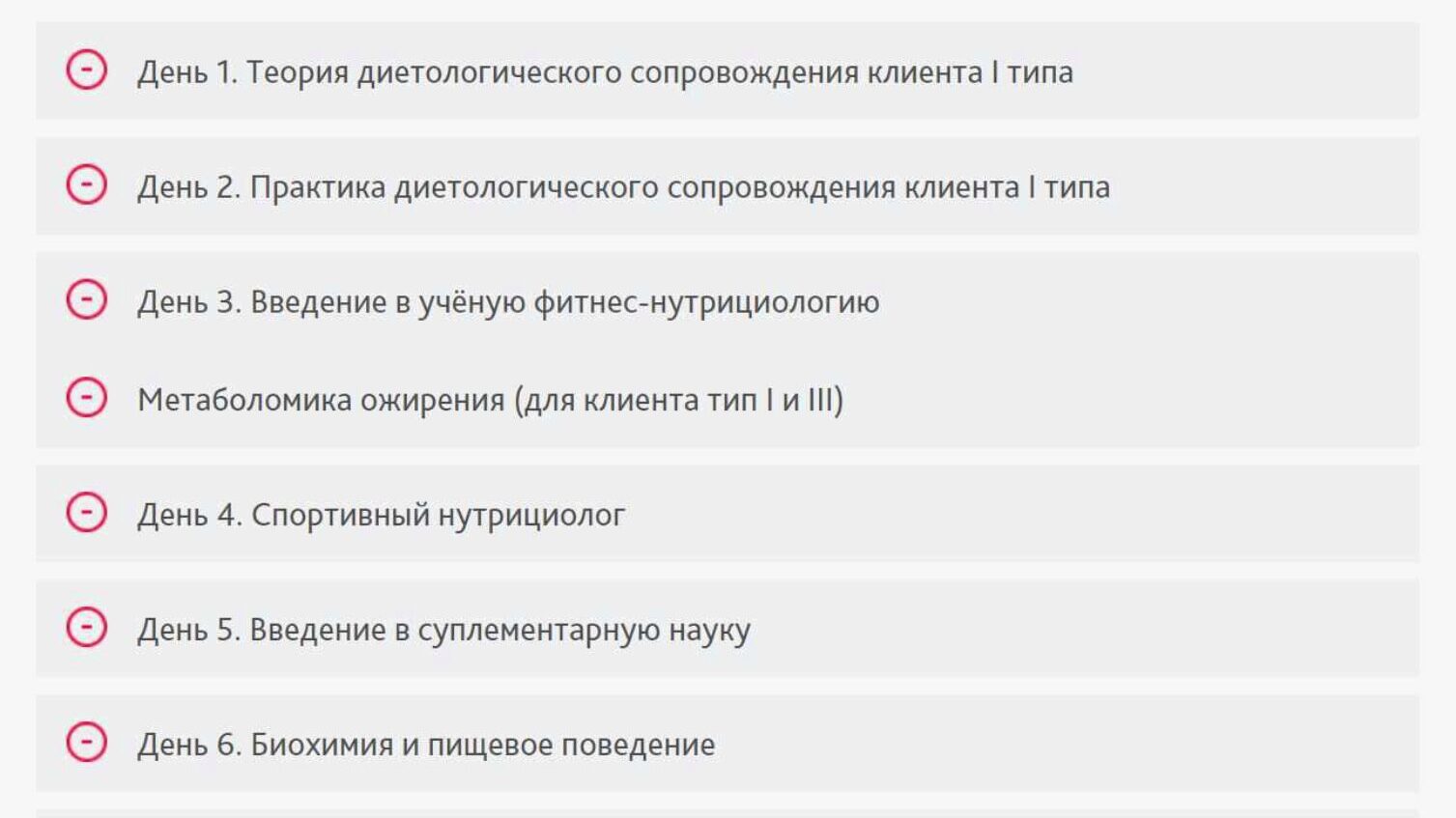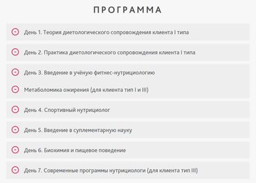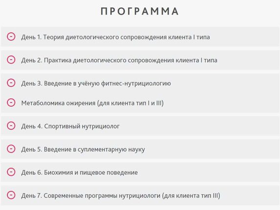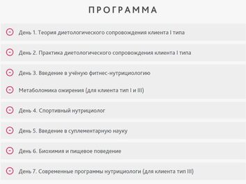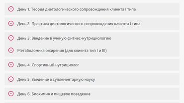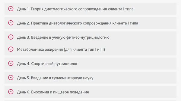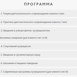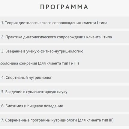 Курс по нутрициологии фитнеса (диетологическому сопровождению) состоит из двух частей: диетологическое сопровождение клиента типа I; диетологическое сопровождение спортсменов. Первая часть курса включает в себя обучение правильному питанию клиентов «новичков» (тип I). На нем Вы научитесь работать с