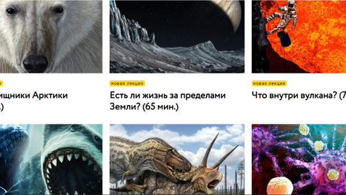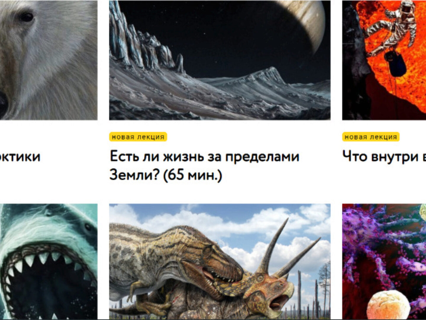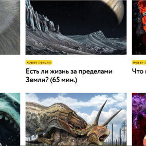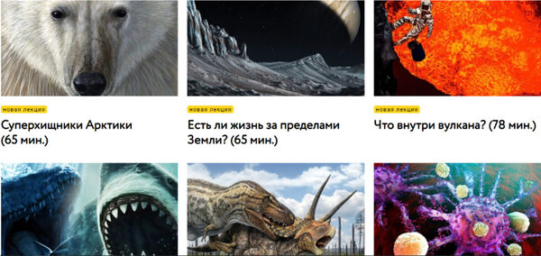 новая лекция Травоядные против хищников (75 мин.) новая лекция Как появились домашние животные? (60 мин.) новая лекция Что внутри вулкана? (78 мин.) От кого произошли динозавры? (60 мин.) Жизнь и смерть кораллового рифа (65 мин.) Суперхищники Арктики (65 мин.) Мегалодон против мозазавра (60 мин.)