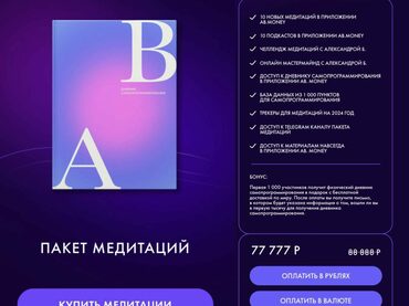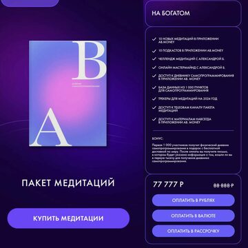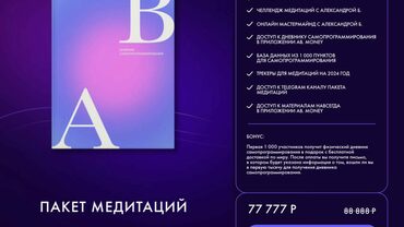 Состав пакета медитаций Саши Беляковой (Sasha Belair) 7 медитаций на повышение дохода Медитация роскоши Медитация изобилия Денежная медитация Легендарная денежная медитация Медитация самопрограммирования Медитация нового уровня Money meditation 8 медитаций на работу с беспокойным мозгом Медитация