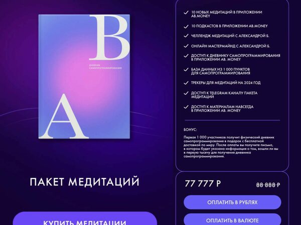 20 Новых авторских медитаций Совершенно новые медитации для курса AB.MONEY, которые станут вашими помощниками на пути к новой жизни. 5D Медитация пробуждения и выхода из матрицы Медитация Рода 2.0 Медитация перерождения Медитация исцеления себя Медитация расширения денежной емкости Медитация