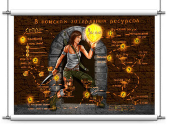 Игра «В поисках затерянных ресурсов»» представляет собой трансформационную игру с элементами арт-терапии, объединенную общим сюжетом. Цель игры: «наполниться» ресурсом, «войти» в ресурсное состояние для активации жизненных сил организма, исполнения поставленных задач, достижения желаемого.