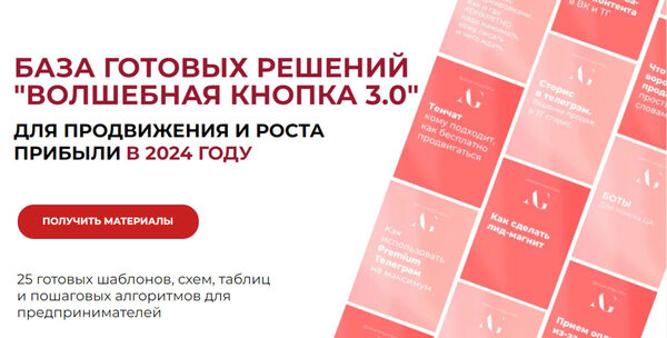 Да, Вы можете получить получить бесплатно фрагмент курса «Волшебная кнопка 3.0. База готовых решений. Тариф Волшебная кнопка 3.0+2.0», просто напишите на почту или в телеграм