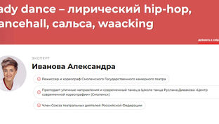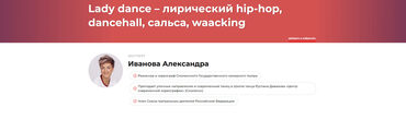 Курс Lady dance - лирический hip-hop, dancehall, сальса, waacking, автор Александра Иванова. Насыщенный материал, который вбирает в себя базовые элементы, хореографию и импровизацию в разных уличных стилистиках. Курс подойдет танцорам любой направленности в качестве источника вдохновения и ознакомления с новыми для себя стилями.