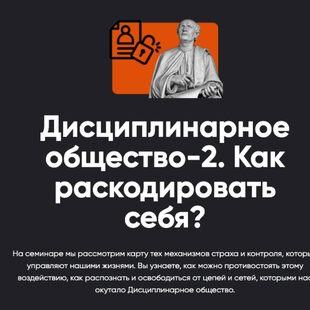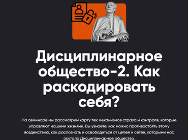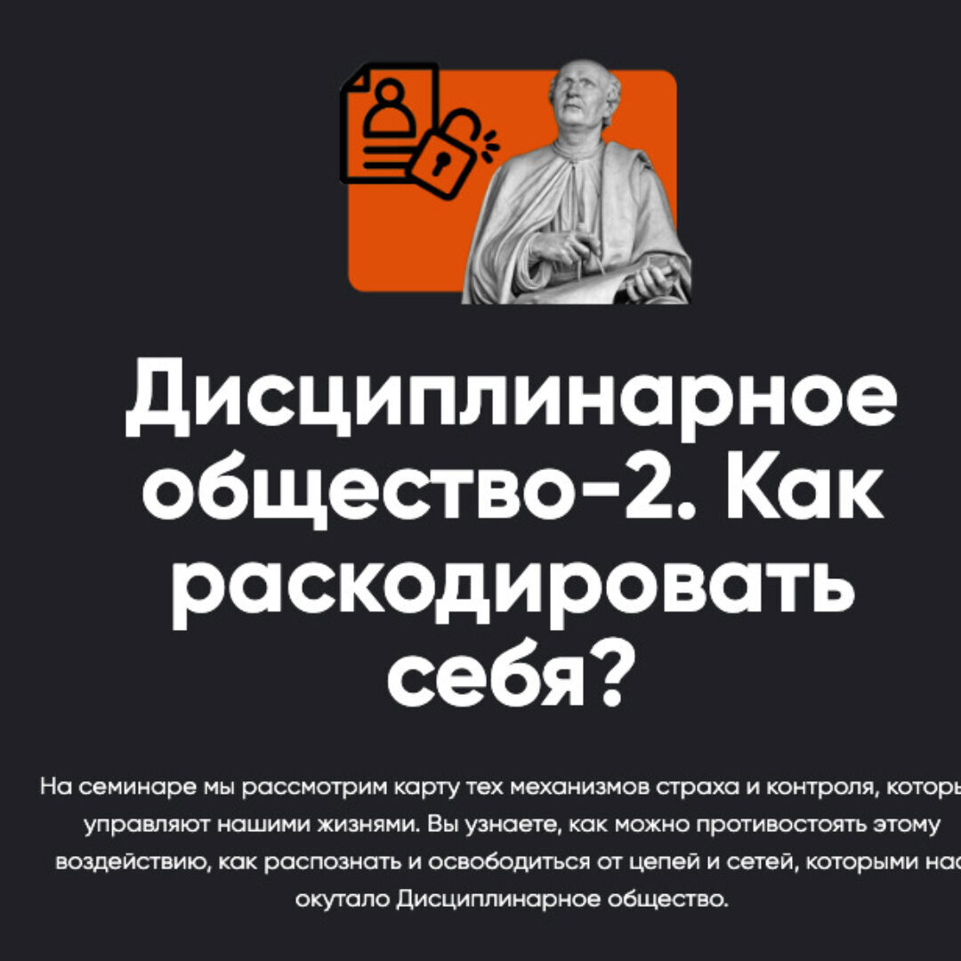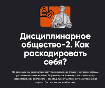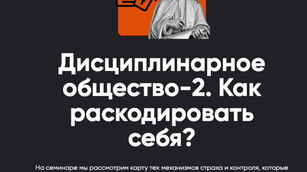 Семинар «Дисциплинарное общество-2» развернет перед вами карту тех механизмов страха и контроля, которые управляют нашими жизнями.