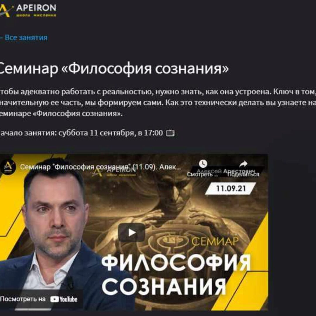 Курс Apeiron - Философия сознания, автор Алексей Арестович. Чтобы адекватно работать с реальностью, нужно знать, как она устроена. Ключ в том, что значительную ее часть, мы формируем сами. Как это технически делать вы узнаете на семинаре «Философия сознания».