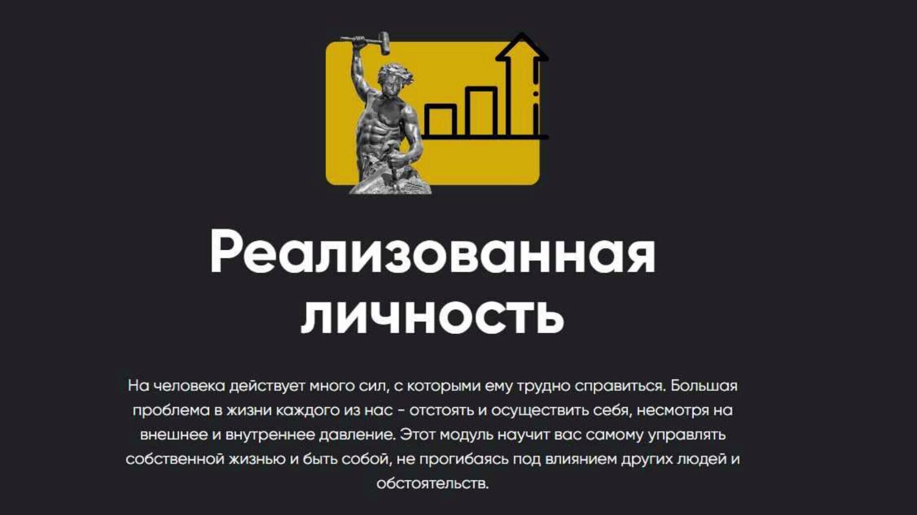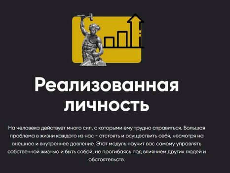 Новый модуль «Реализованная личность» или искусство быть АрестовичемВ процессе жизни человек является неотъемлемой частью чьего-то плана и неизбежно его выполняет. Если мы не осознаем его — это план чужой. Если осознаем, то есть шанс, что этот план свой. Но чтобы прописать свой план и его выполнить, надо кое-что технически уметь и иметь соответствующие способности. Созданию этих способностей и посвящен модуль. За 5 занятий вы узнаете, как стать другим человеком, лучшей, сильной и уверенной версией самого себя.Большинство из нас — люди скомканные, смятые большими сверхчеловеческими силами — давлением социума, коллективным бессознательным, государством. Скомканные люди не могут защитить себя, не могут реализовать свой проект.Нереализованный человек никогда не сможет избавиться от сильного чувства внутренней иррациональной тревоги, никогда не сможет перестать болеть, никогда не сможет стать счастливым, никогда не сможет получать от жизни удовольствие и никогда не сможет дарить его другим, то есть строить нормальные отношения с другими людьми. Зато реализованный человек меняется радикально. Он наполняется изнутри, начинает раздавать очень светлый и позитивный WI-FI и к нему начинают тянуться люди. С помощью этих людей он творит жизнь свою и помогает другим