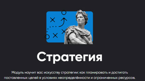Модуль научит вас искусству стратегии: как планировать и достигать поставленных целей в условиях неопределённости и ограниченных ресурсов. Стратегия нужна, когда у вас есть цель, но нет ресурсов на ее осуществление. Искусство стратегического планирования в этом случае сводится к поиску и мотивации