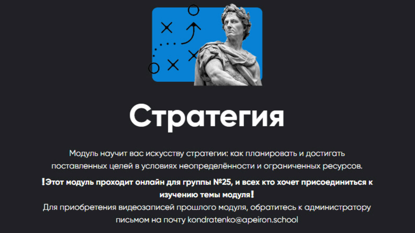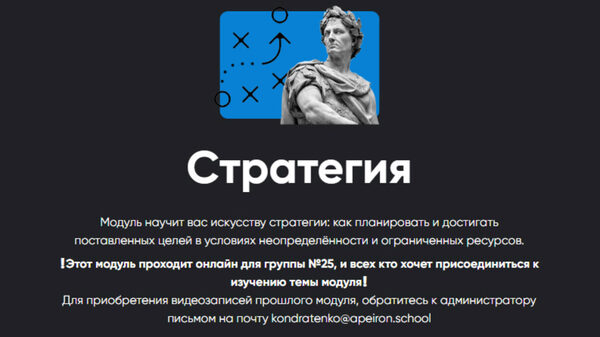 Курс Apeiron - Стратегия 2023. Занятие 5, автор Алексей Арестович. Модуль научит вас искусству стратегии: как планировать и достигать поставленных целей в условиях неопределённости и ограниченных ресурсов.