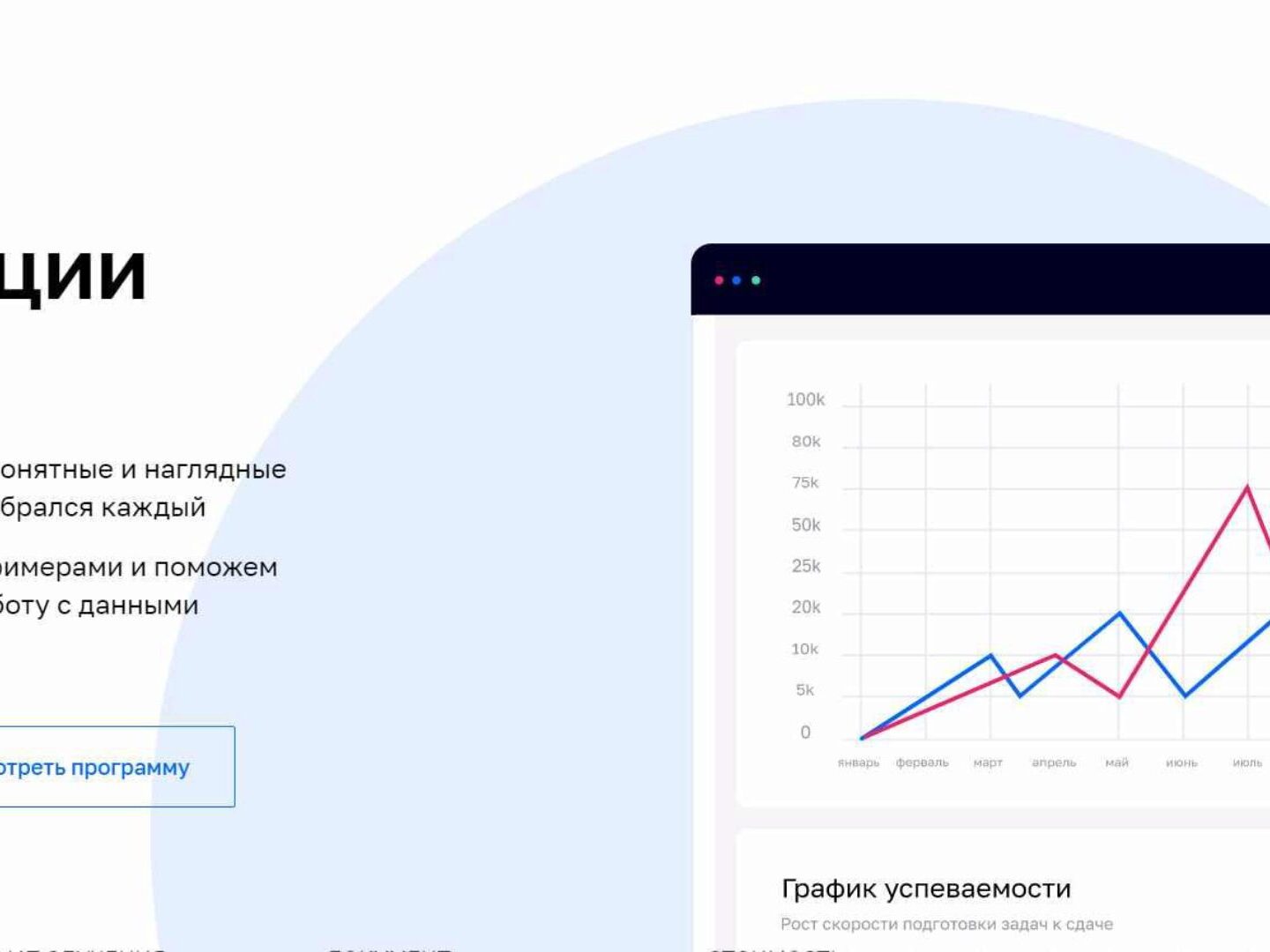 - По итогу программы вы построите дашборд, график и подготовите шаблоны для новых задач. В основе проекта — данные компании либо актуальные данные о том, что происходит в мире.