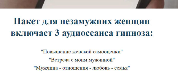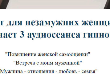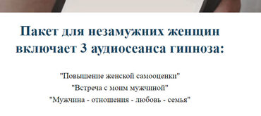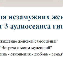 Показания: Данный пакет аудиосеансов предназначен для женщин, не находящихся в браке. Можно прослушивать, если вы находитесь в отношениях или не состоите в них.
