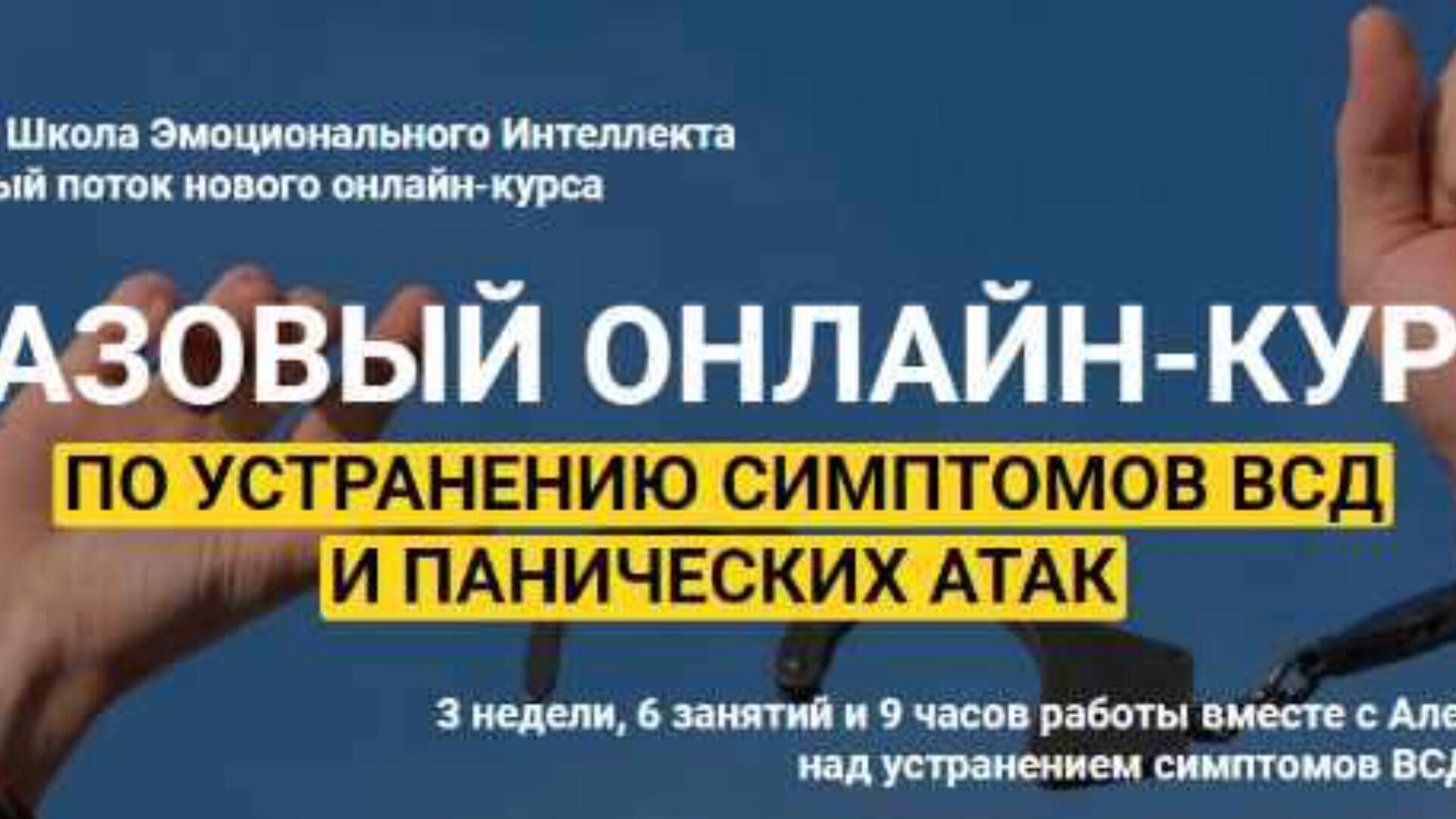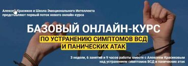 Базовый онлайн-курс по устранению симптомов ВСД и панических атак — это программа Алексея Красикова и Школы Эмоционального Интеллекта, на которой за 3 недели, 6 занятий и 9 часов работы вместе с Алексеем Красиковым вы сможете раз и навсегда избавиться от многочисленных симптомов, так называемой, «вегетососудистой дистонии» и панических атак.