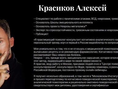 Основной онлайн-курс Алексея Красикова по управлению эмоциями и развитию стрессоустойчивости 21 сезон — это основной онлайн-курс Алексея Красикова по управлению эмоциями и развитию стрессоустойчивости. Основная цель этой онлайн-программы состоит в том, чтобы обучить навыкам осознания своих эмоций и
