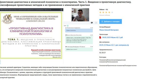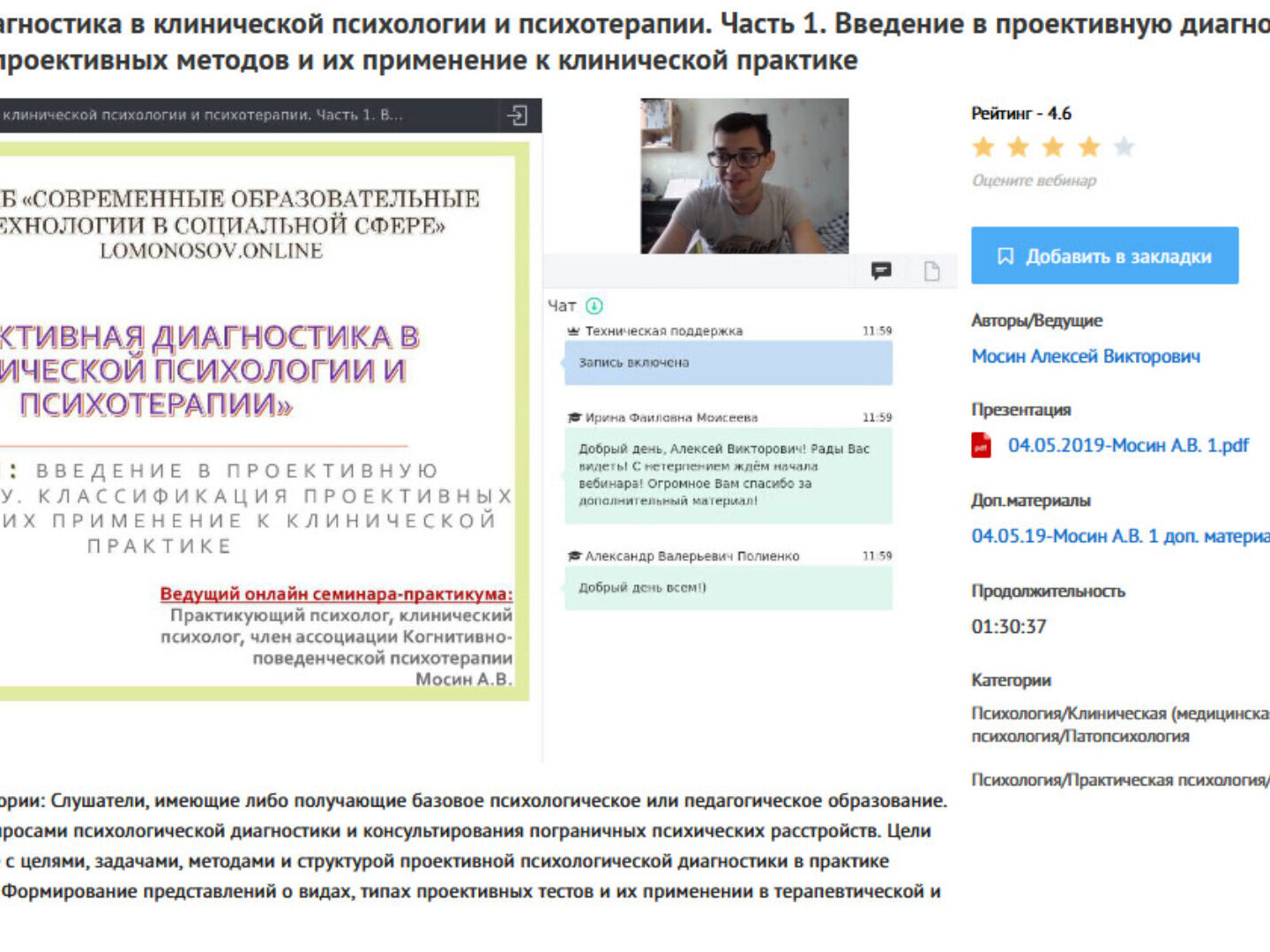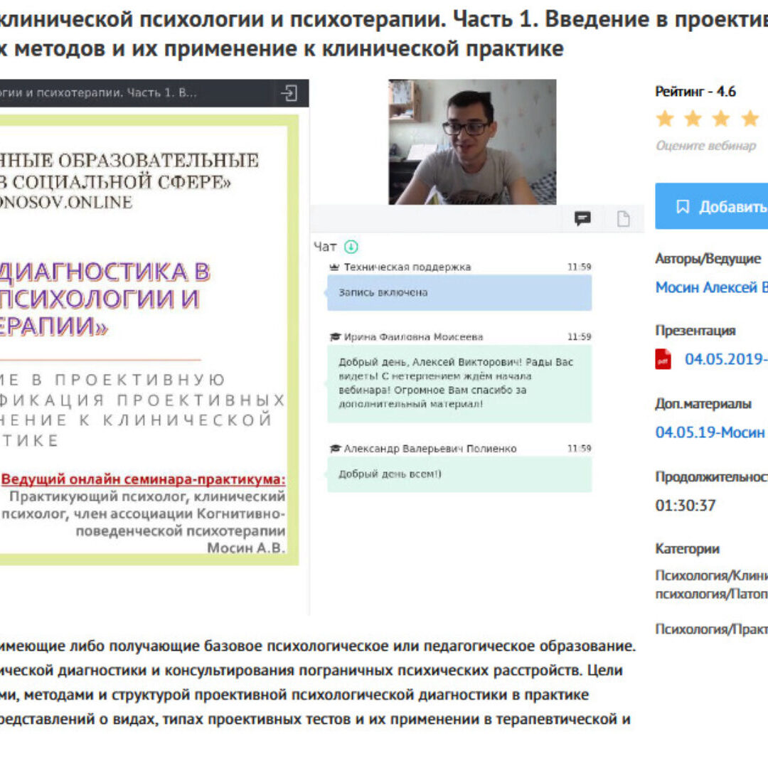 Отзывы о курсе Вебинары «Проективная диагностика в клинической психологии и психотерапии» от Алексея Мосина