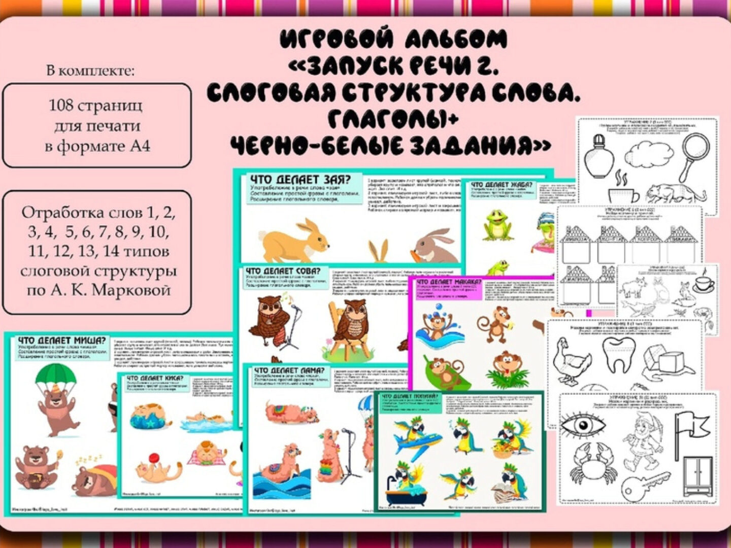 МЕГА БОЛЬШОЙ игровой альбом Запуск речи. Слоговая структура слова. 🟢14 типов ССС 111 страниц для печати 🟣Огромный лексический словарь 🟠Говорим, клеим, лепим,обводим, рисуем и много другое 🟡 Упражнения на моторику, познавательные процессы, творчество