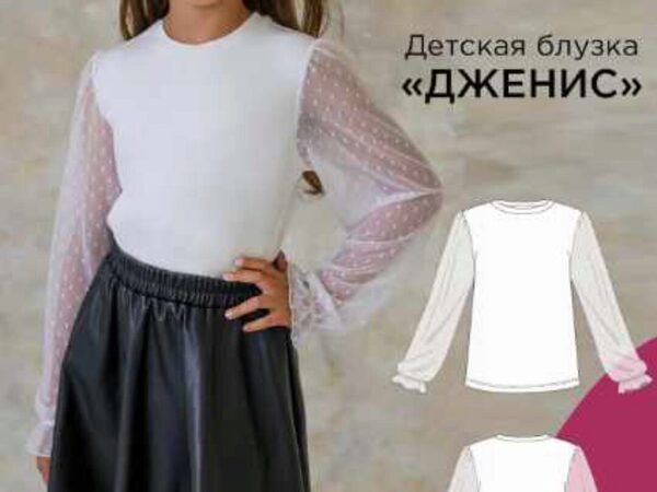 Детская блузка «Дженис» — это стильная базовая модель из удобного и мягкого трикотажа с акцентными рукавами из сетки. Такая блузка подойдёт как в качестве праздничного наряда на любое торжественное мероприятие, так и на каждый день в садик или школу. Блузка прямого силуэта, среднего объёма — самый аккуратный и практичный вариант даже для ежедневного использования. Горловина модели округлой формы и обработана бейкой из основной ткани, благодаря чему она отлично повторяет форму среза и нежно прилегает к телу. Также несмотря на отсутствие дополнительных застёжек блузка без труда снимается и надевается, не доставляя дискомфорт даже самым маленьким моделям. Рукава в изделии длинные, выполненные из прозрачной эластичной сетки со сборкой по окату. А по низу они утянуты резинкой, которая образует рюшу. Благодаря такой конструкции рукава модель приобретает очень нежный и романтичный образ. Длина блузки – до линии бедра, нижний срез обработан в подгибку. Такая обработка очень простая в исполнении, а в изделии выглядит крайне опрятно.