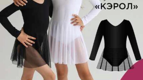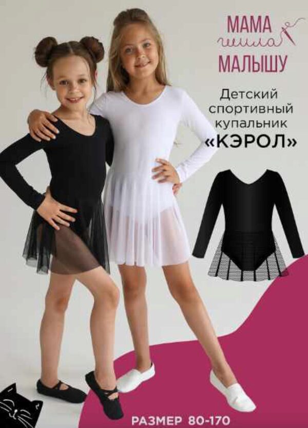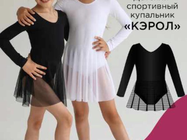 Изделие малого объёма. Горловина по переду овальной формы, по спинке вырез более глубокий чем по переду. Это позволяет без труда самостоятельно снимать и надевать изделие без дополнительных застёжек, и при этом юной спортсменке позволит чувствовать себя комфортно и уверенно. Рукава в данной модели длинные, срез обработан в подгибку. Длину рукава, по желанию, можно изменить. Вырезы по ножкам и горловина купальника обработаны мягкой эластичной резинкой, что позволяет изделию прекрасно фиксироваться на фигуре, не пережимая и не сдавливая при этом тело. Особое очарование и игривость модели придаёт струящаяся юбка из сетки, которая располагается по линии талии и прикрывает ягодицы. Благодаря высокой эластичности материала, из которого необходимо выполнить купальник и особенностям его кроя, изделие прекрасно садится по фигуре и не сковывает движения во время занятий. Обязательно сшейте купальник «Кэрол» ребенку, который занимается танцами или спортом. Ведь это самое необходимое изделие для тренировок и даже выступлений на сцене.