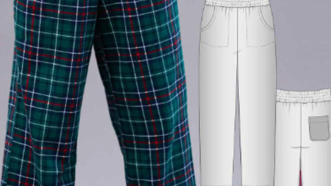 Выкройка брюк умеренного объема, прямого силуэта, зауженных книзу. По низу брюк притачные манжеты из кашкорсе. Пояс цельнокроеный, на резинке. По поясу проложены две строчки, образующие кулиску, в которую вставлен шнур. На передних половинках брюк карманы в боковых швах с настрочной мешковиной и