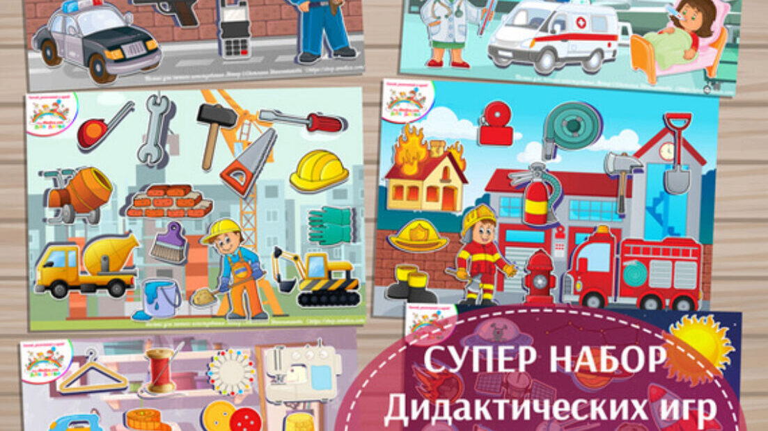 Тематический комплект «Мир профессий» для детей 3-7 лет Комплект состоит из развивающих материалов и развивающих заданий для детей и знакомит с темой профессии людей. В тематический комплект игр и материалов «Мир профессий» входит: дидактические карточки «Мир профессий»; презентации на тему «Мир