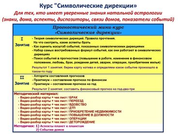 Занятия посвящены методике Символических Дирекций, которые так любят все студенты и практикующие астрологи за легкость вычисления. Четыре вебинара, 12 часов, мы с вами практикуемся в работе Дирекций по вашим гороскопам и по гороскопам близких людей. Выясняем, чем отличаются дирекции в угловых домах