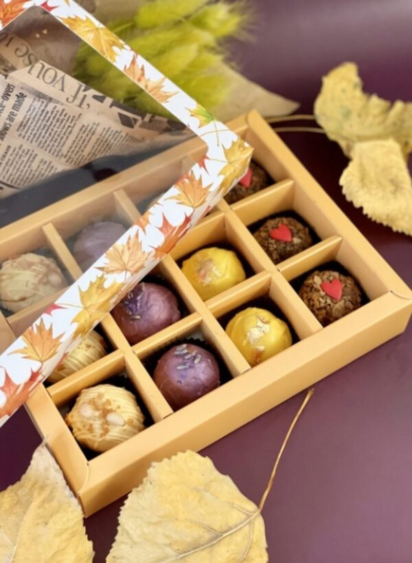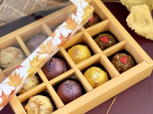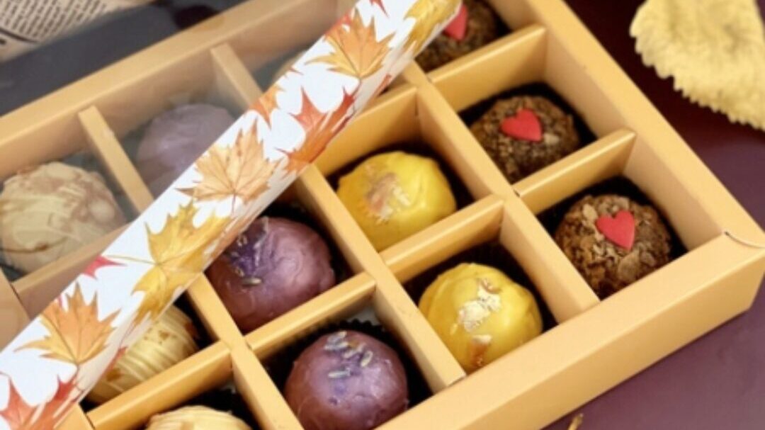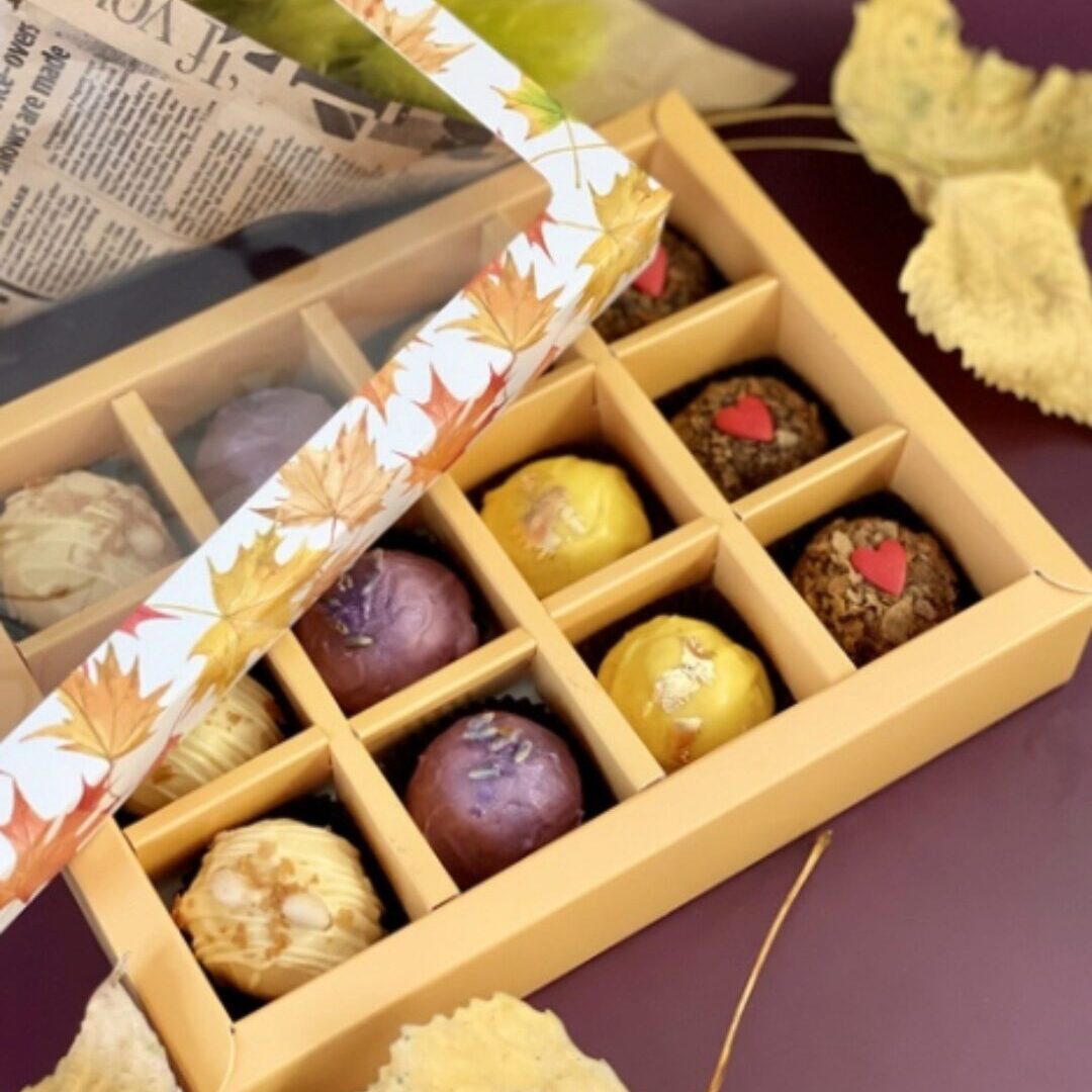 Трюфели 1.0 карамель с солью клубника с шампанским кофе с айриш крим черная смородина с ликером зелёный чай, имбирь, лимон мята и лайм фундук маракуйя и карамель кокос с лаймом апельсин с чаем эрл грей Трюфели 2.0: клюква, апельсин и корица земляника с грейпфрутом рождественское печенье дыня с