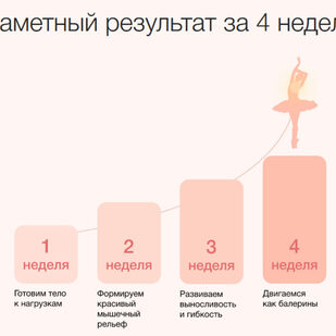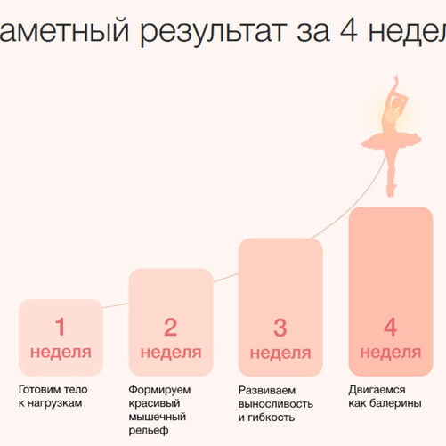 За 4 недели занятий под руководством примы-балерины вы убедитесь, что видимый результат могут дать даже простые упражнения и что сам процесс занятий может дарить вдохновение. После курса физические упражнения войдут в привычку, а ваши движения станут более пластичными и изящными даже в повседневной жизни.