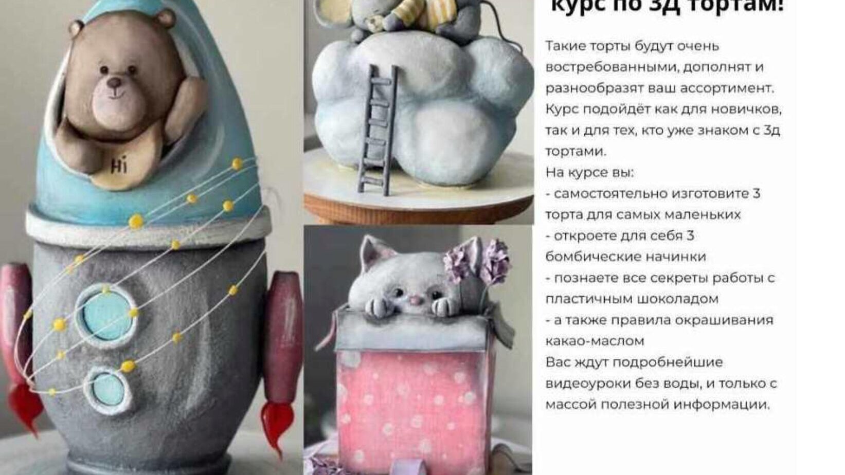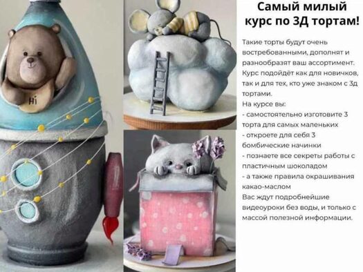 Самый милый курс по 3д тортам «Игрушки» от Анастасии Казарьянц @pro.moi.tort Такие торты будут очень востребованными, дополнят и разнообразят ваш ассортимент. Курс подойдёт как для новичков, так и для тех, кто уже знаком с 3д тортами. На курсе вы: - самостоятельно изготовите 3 торта для самых