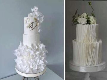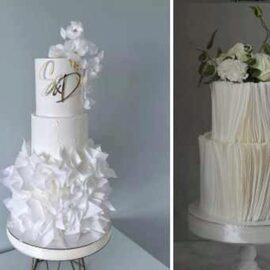 • Торт из 4-х ярусов с акцентным построением и юбкой из вафельной бумаги. Укрепление и сборка торта из 4 ярусов. Выравнивание ганашом на белом шоколаде и покрытие велюром. Работа с мастикой и вафельной бумагой. Создание юбки из вафельной бумаги. Изготовление вафельных цветов и веточек. Создание мастичных элементов. Декорирование торта