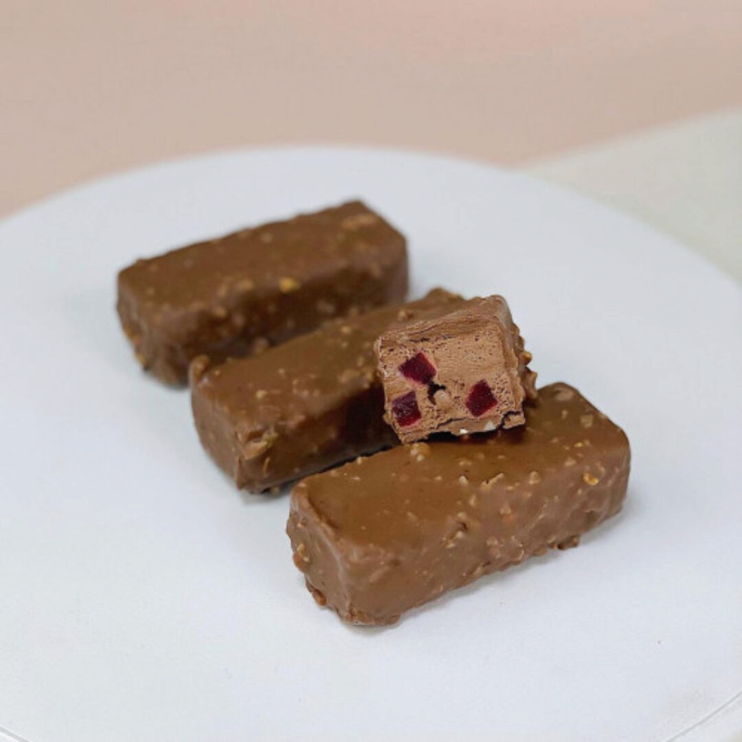 Крем на основе сыра с добавление горгондзолы и кули из маракуйя в начинке. - Батончик «Малина - кокос» Благородное сочетание нежного, взбитого, кокосового ганаша с ярким кули малины.