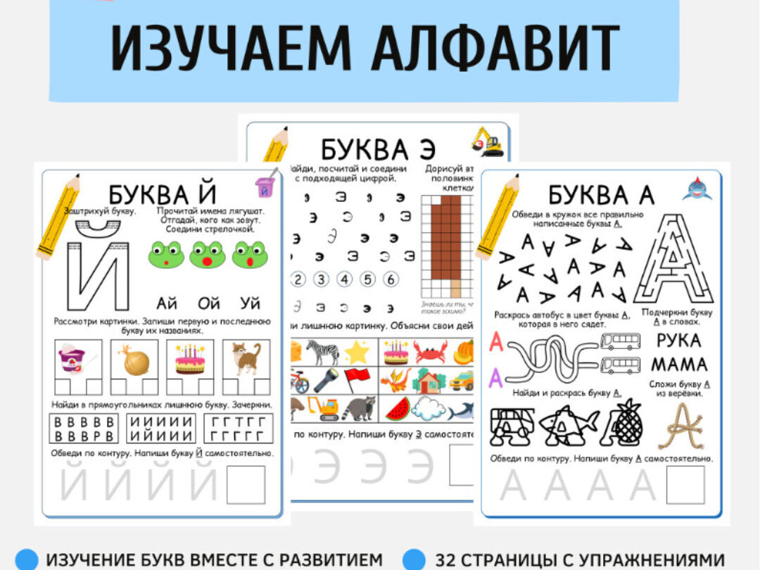 32 страницы с разнообразными упражнениями для изучения и закрепления букв. От 4 до 7 упражнений на каждую букву.