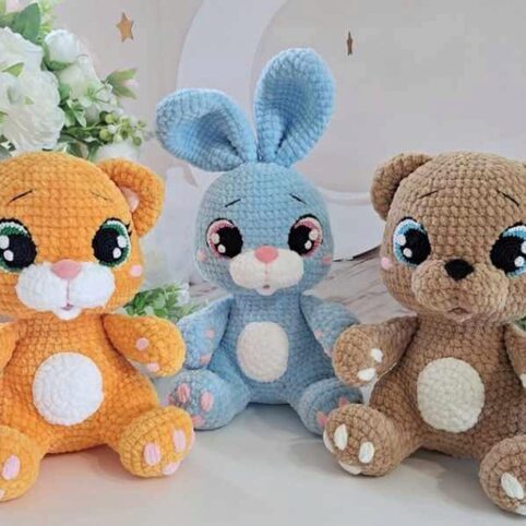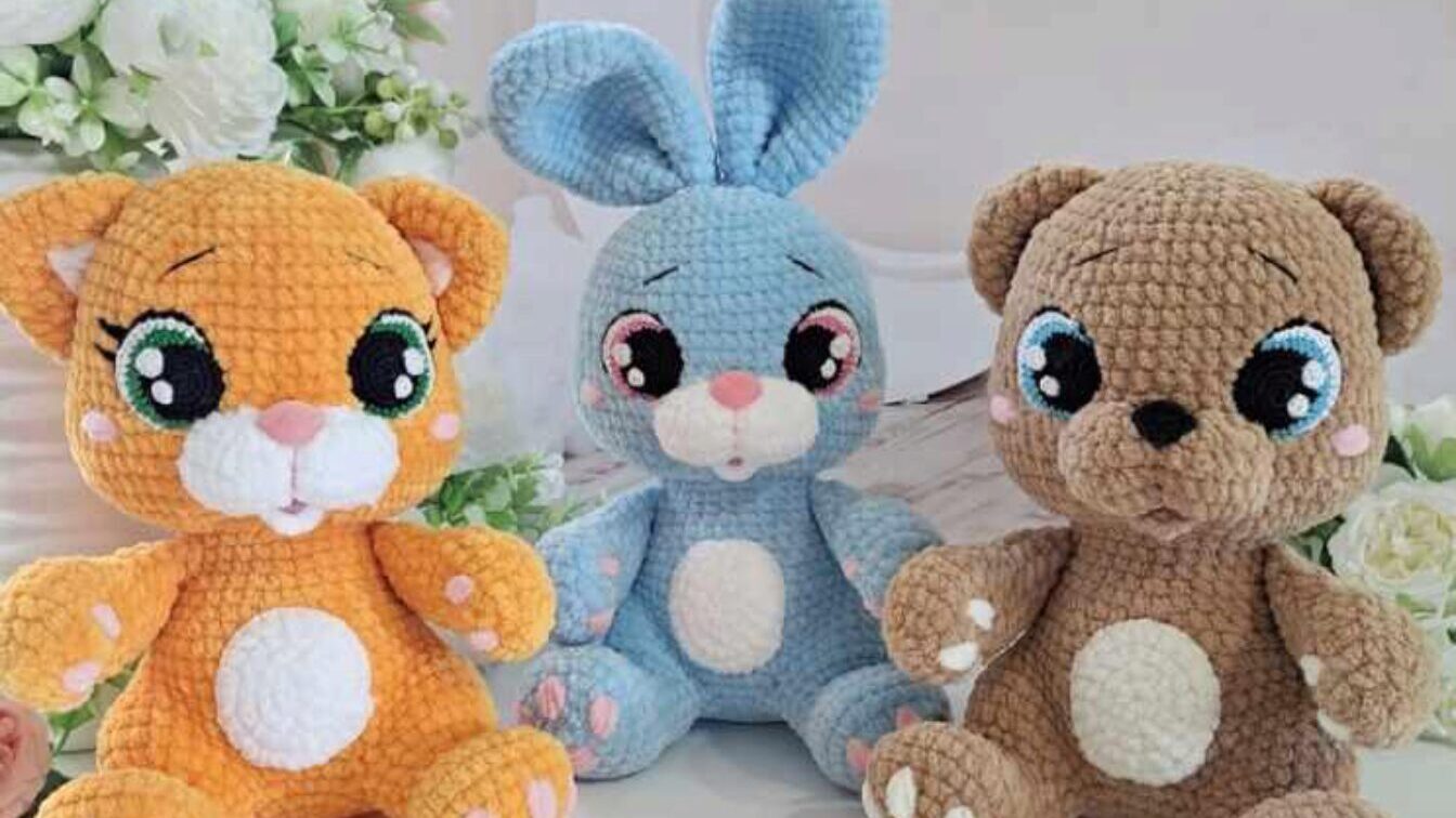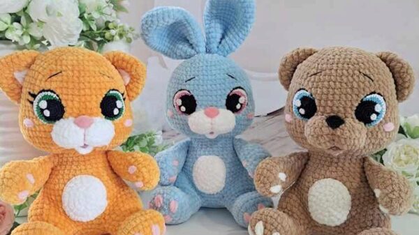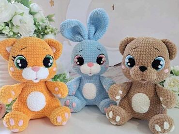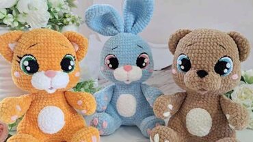 [Toys_knit_anny] Мастер-класс 3 в 1 Плюшевые лапки Мастер-класс включает в себя: описание вязания 3-х игрушек: зайки, мишки и котика; фото готовых деталей игрушек ; видео по оформлению игрушки: утяжка мордочки, глазок, пришивание ручек и ножек, оформление бровок и век, вышивание носика. Для работы