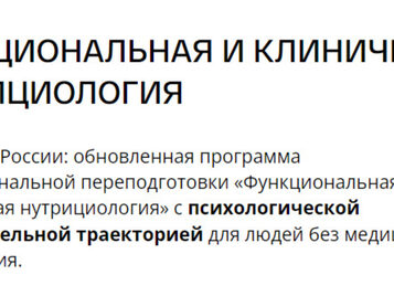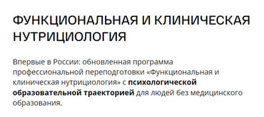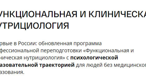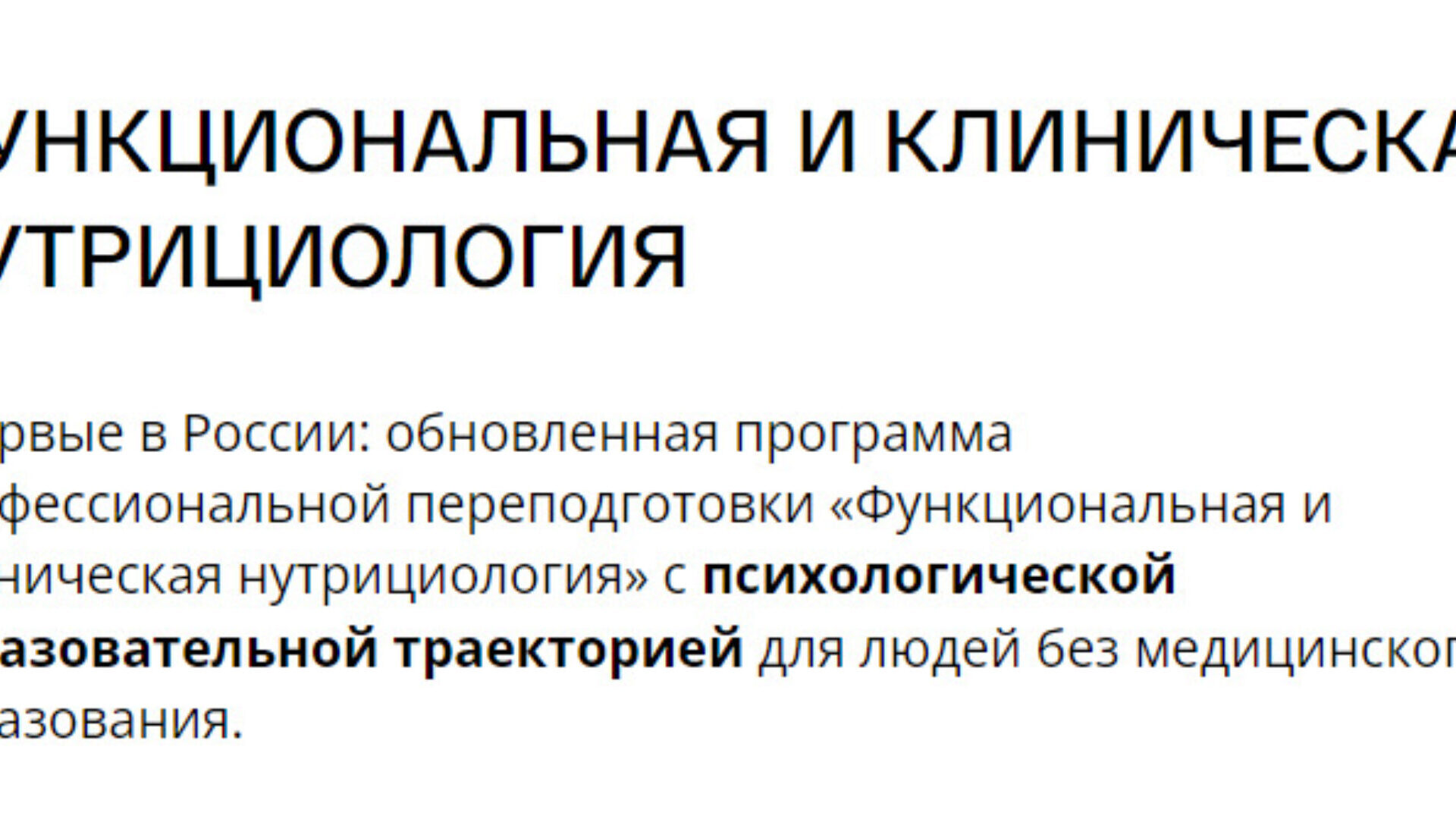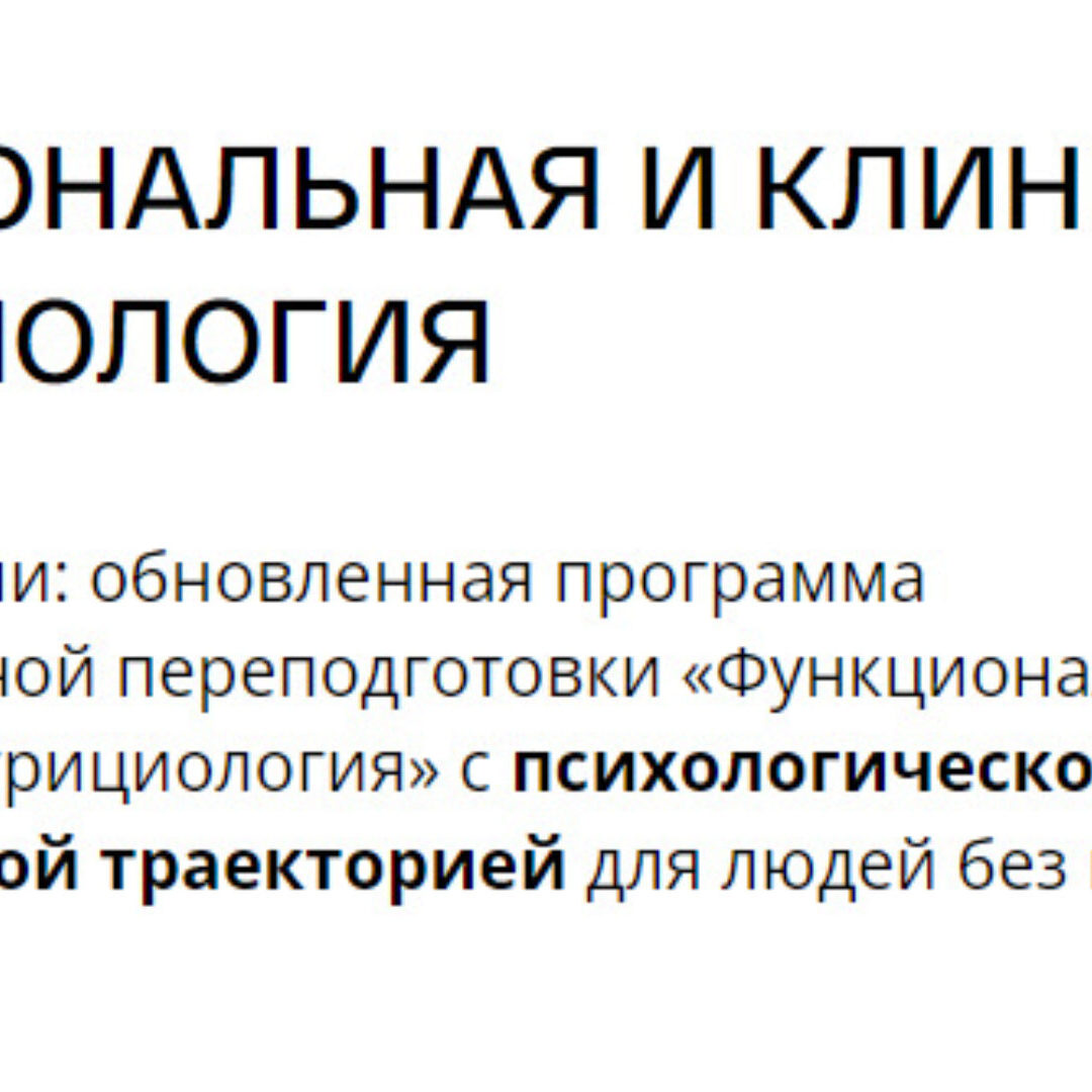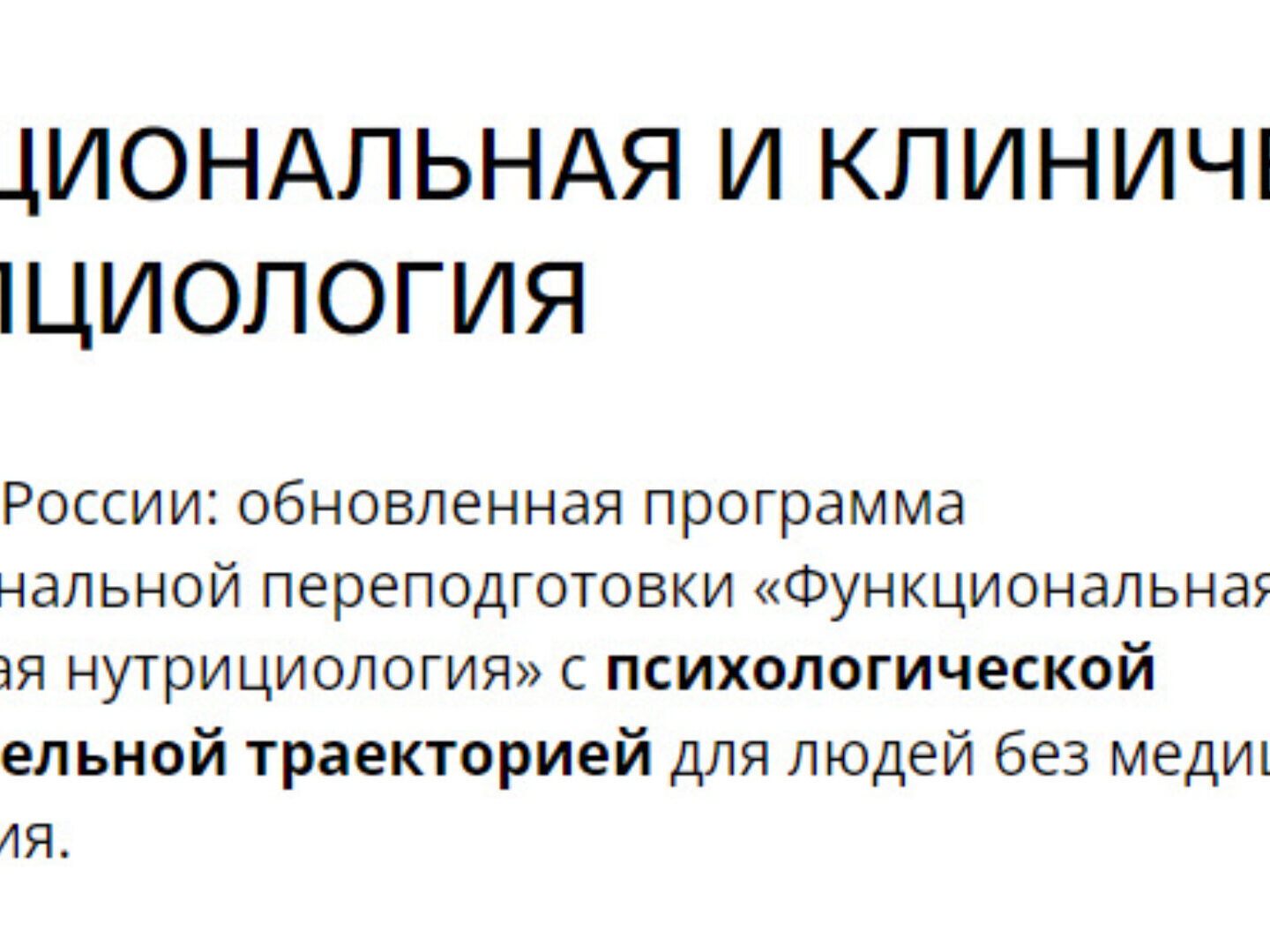 Первая в России международная университетская программа профессиональной переподготовки специалистов по функциональной и клинической нутрициологии для людей без медицинского образования. Кому подойдет программа: -Профессионалам в сфере ЗОЖ: специалистам PreventAge-медицины, health-коучам,