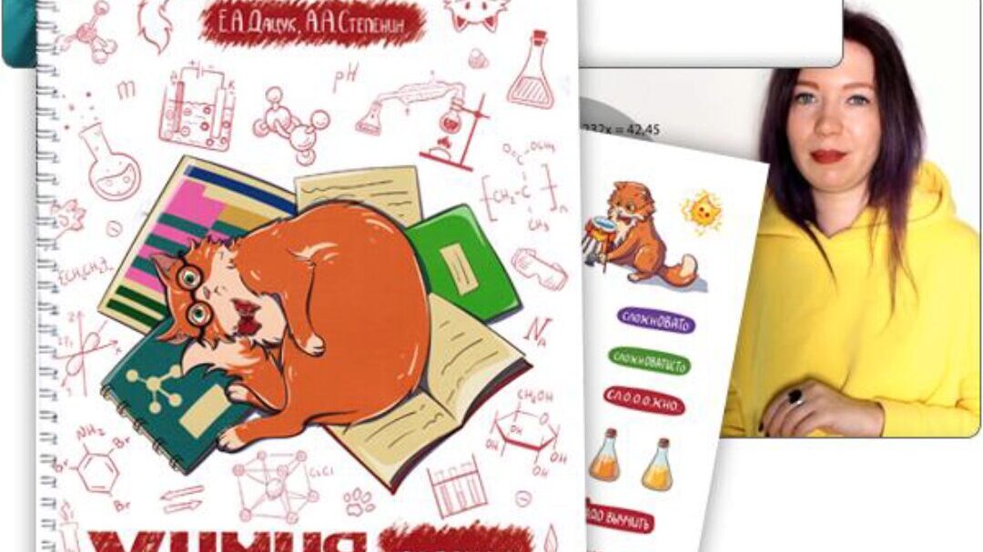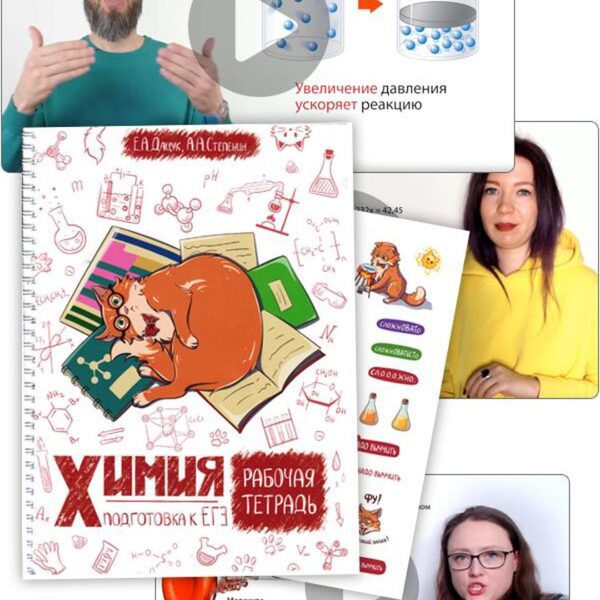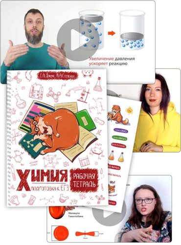 Комплект печатных материалов. 3 бумажных рабочих тетради с конспектами: неорганическая химия (150 стр.), органическая химия (180 стр.), РИО (88 стр.). А также наклейки с Химическим Котом, таблица Менделеева и растворимости с авторскими шпаргалками.
