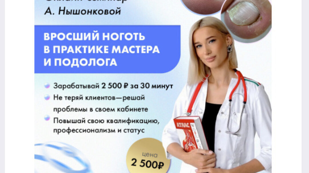 Надоело отдавать своих клиентов другим специалистам? Как часто вы отправляете клиентов к подологу? После вебинара: Узнаете все о строении ногтевого аппарата, профилактики деформаций и врастания; Сможете помогать клиентам с поперечной деформацией (скручиванием); Научитесь вести клиентов с вросшим