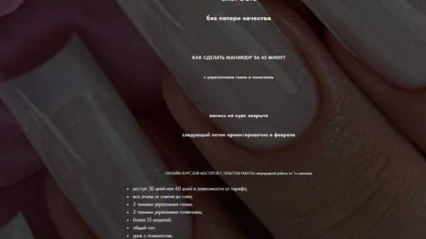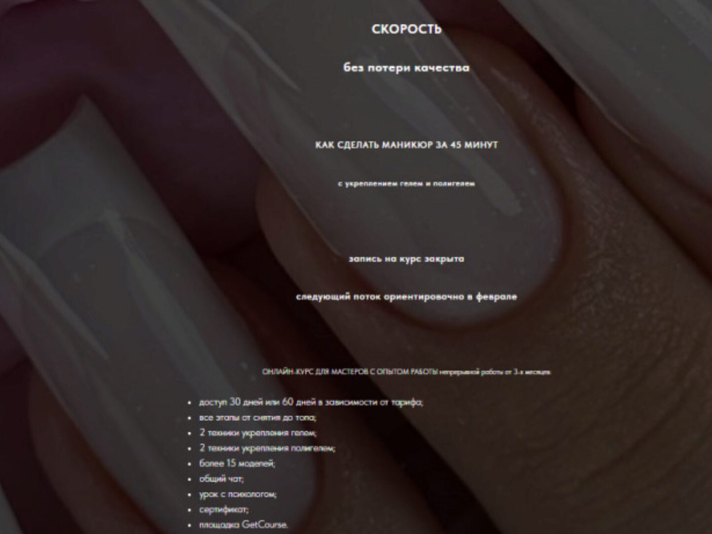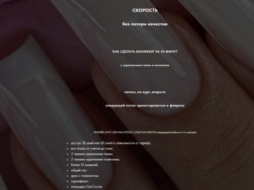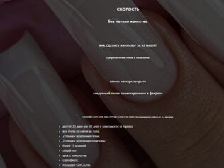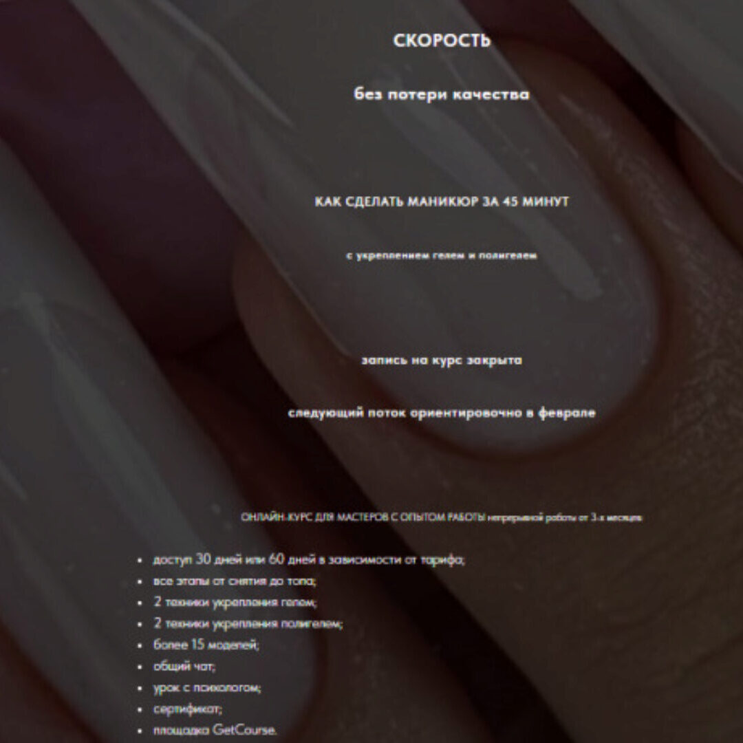 Курс по скорости без потери качества от супер скоростного мастера(рекорд-26 минут с гелем) подойдёт: мастерам, которые не понимают как ускориться мастерам, которые хотят освоить новую технику работы мастерам, у которых нет чёткого алгоритма работы После прохождения курса вы: избавитесь от лишних
