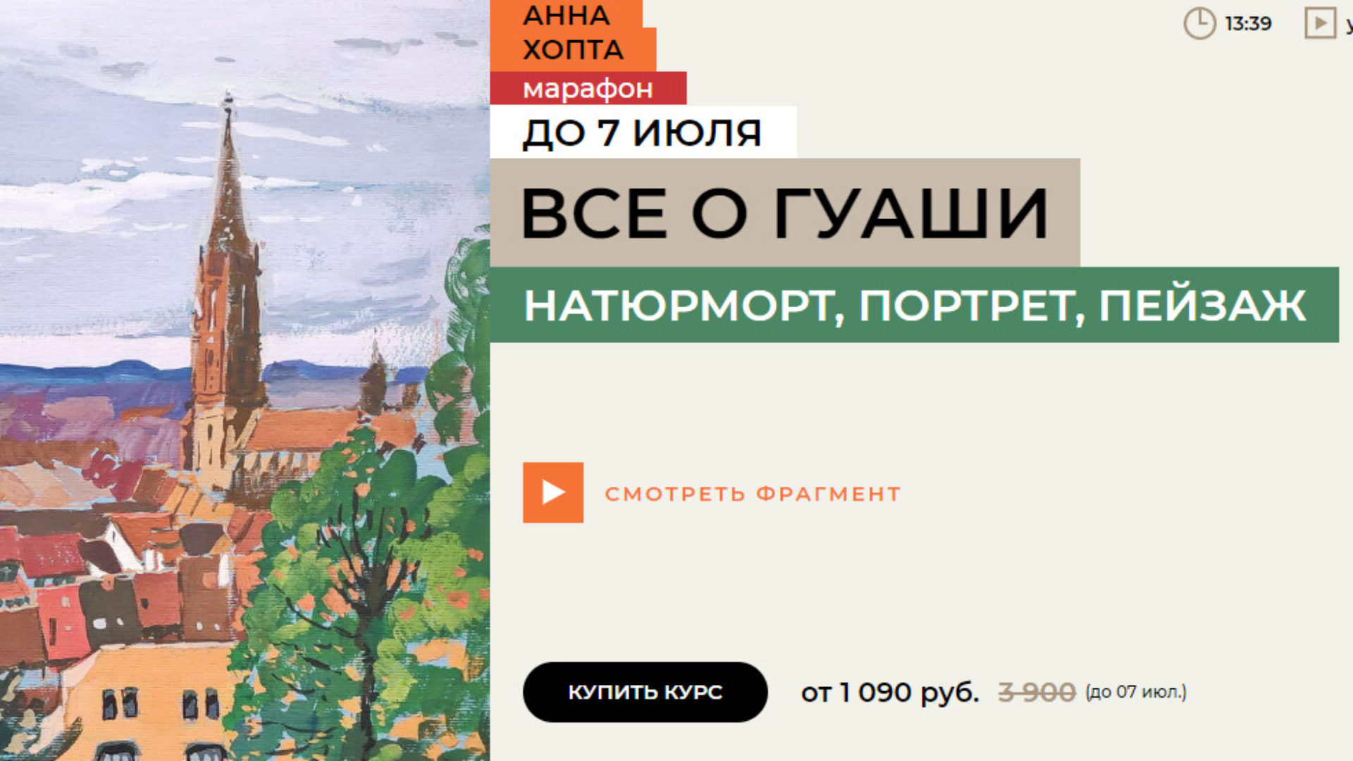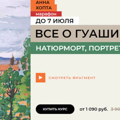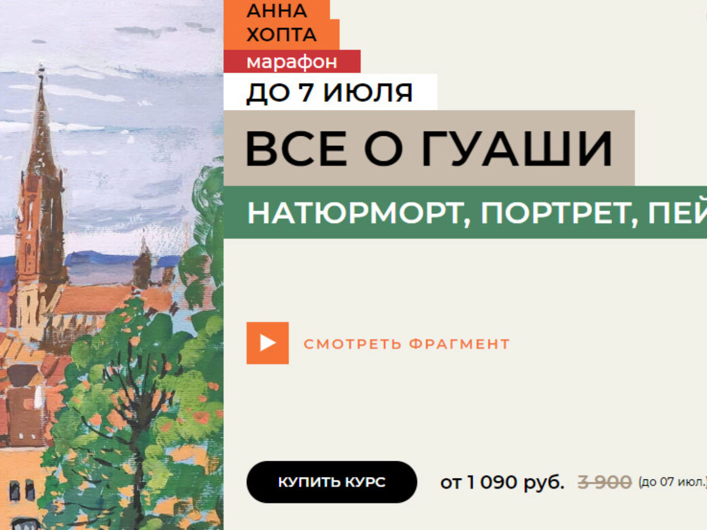 В марафоне Анны Хопта для начинающих узнаем о гуаши всё, что нужно для полноценного старта в этой технике: разберем сам материал и его особенности, потренируемся передавать форму и объем в натюрморте, глубину в пейзаже и естественность в портрете.