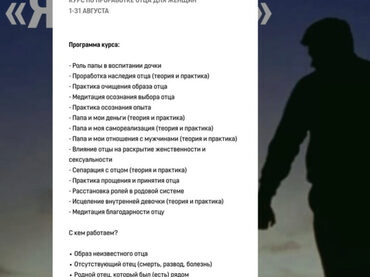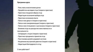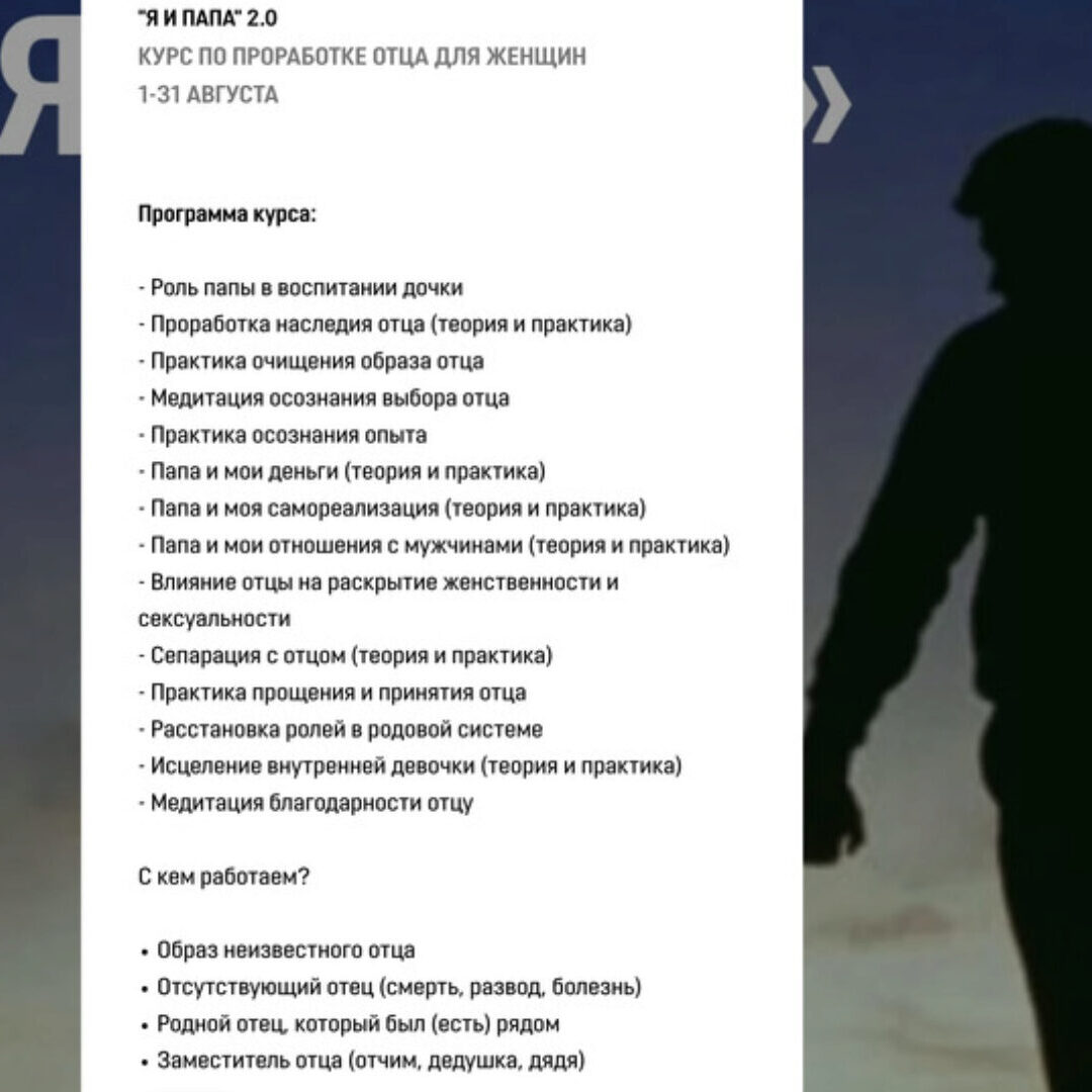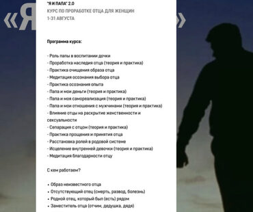 Курс «Папа» для вас, если: у вас проблемы с мужем/мужчинами; не можете встретить «идеального» или выйти замуж вам сложно отказать папе; у вас нет самореализации в жизни; вы поступили учиться по указу папы и сейчас ваша работа вам ненавистна; папа был очень мягким, мама властная, вы ведете себя