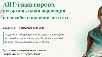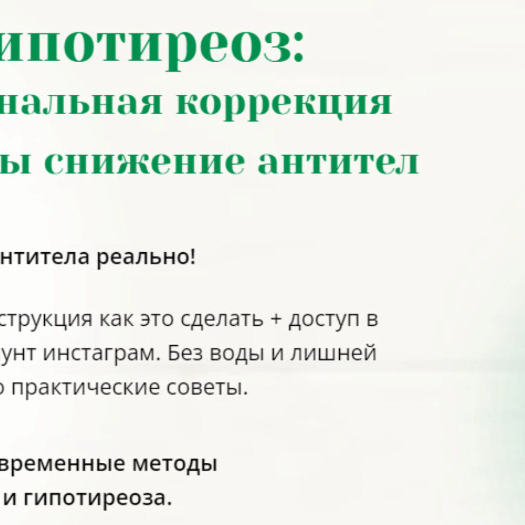 АИТ/гипотиреоз: негормональная коррекция и способы снижение антител Снизить ТТГ и антитела реально! Подробная инструкция как это сделать + доступ в закрытый аккаунт инстаграм. Без воды и лишней теории, только практические советы. Доступные и современные методы коррекции АИТ и гипотиреоза. Для кого: