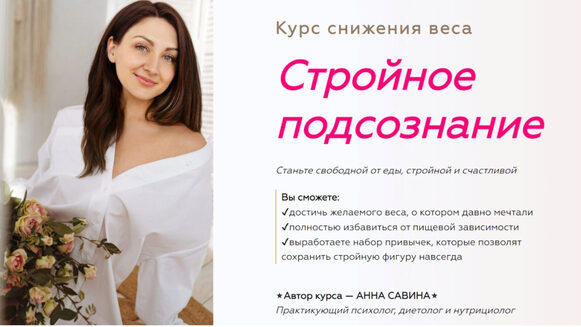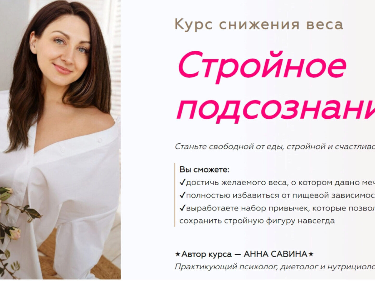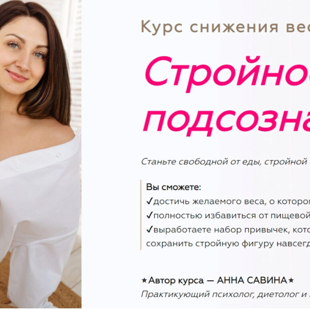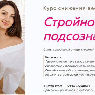 Курс снижения веса Стройное подсознание Станьте свободной от еды, стройной и счастливой Вы сможете: достичь желаемого веса, о котором давно мечтали полностью избавиться от пищевой зависимости выработаете набор привычек, которые позволят сохранить стройную фигуру навсегда Автор курса — АННА САВИНА