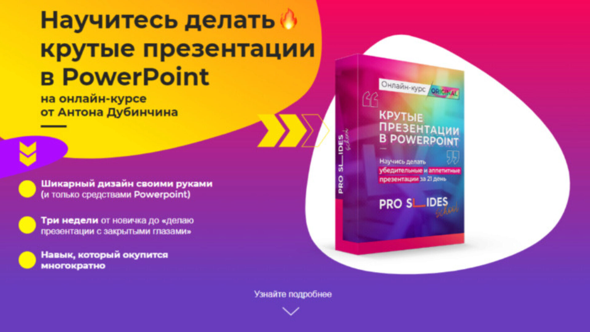 Курс Научитесь делать крутые презентации в PowerPoint. Тариф «Эконом», автор Антон Дубинчин. Шикарный дизайн своими руками (и только средствами Powerpoint). Три недели от новичка до «делаю презентации с закрытыми глазами». Навык, который окупится многократно
