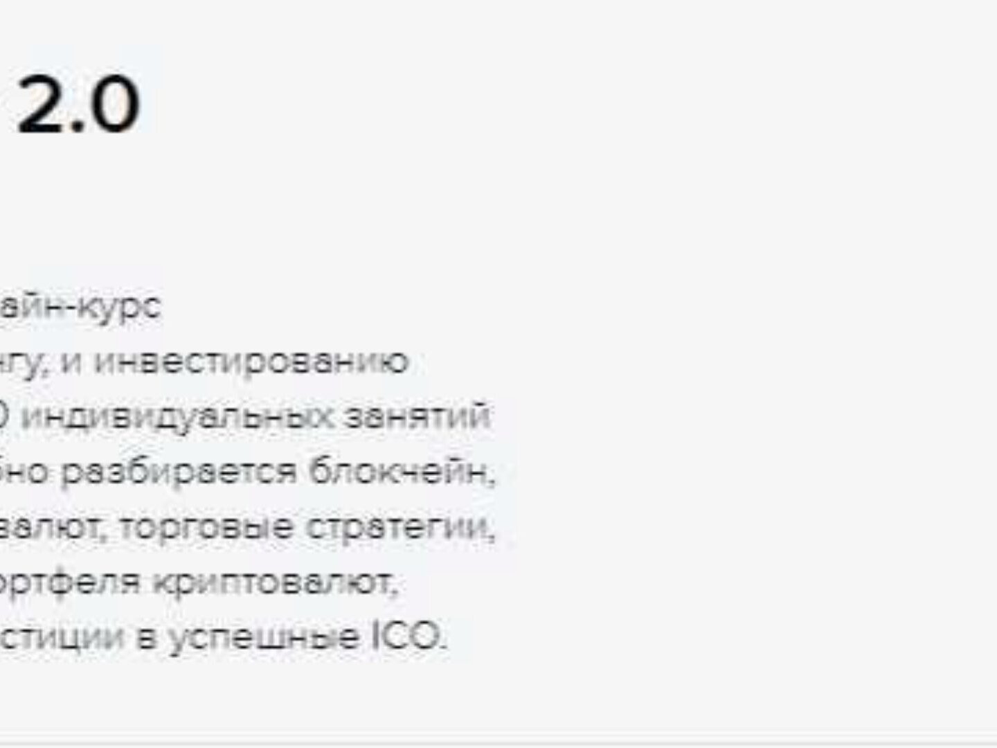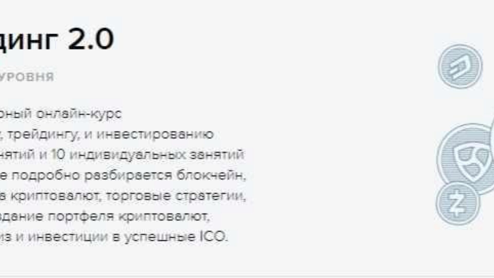 Криптотрейдинг 2.0 - это уникальный и самый обширный online-курс по криптовалютному рынку и майнингу: 7 теоретических, 9 практических занятий и 5 индивидуальных занятий с преподавателем. На курсе подробно разбирается структура блокчейн, что такое майнинг и как на нем заработать. Вся информация о покупке и продаже криптовалют. Вы также узнаете рабочие торговые стратегии, научитесь правильно управлять своим депозитом и минимизировать риски при работе с криптовалютой. Научитесь торговать на самом волатильном рынке и участвовать в рискованных, но потенциально очень прибыльных инвестициях в ICO. Мы также подробно разберем эту тему на примере нашего UTToken ICO.