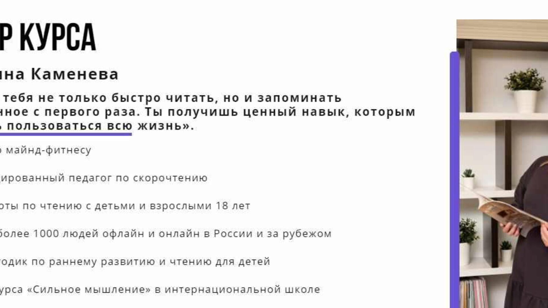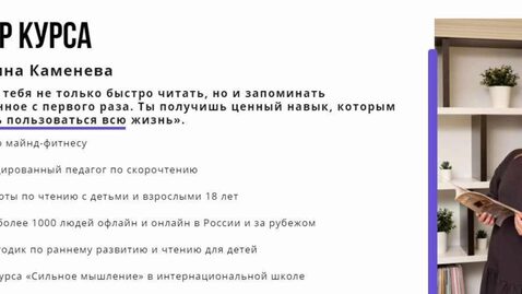 Курс Скорочтение: развиваем бесценный навык для книголюбов, автор Антонина Каменева. Программа курса:11 видеоуроков и 11 практических заданий