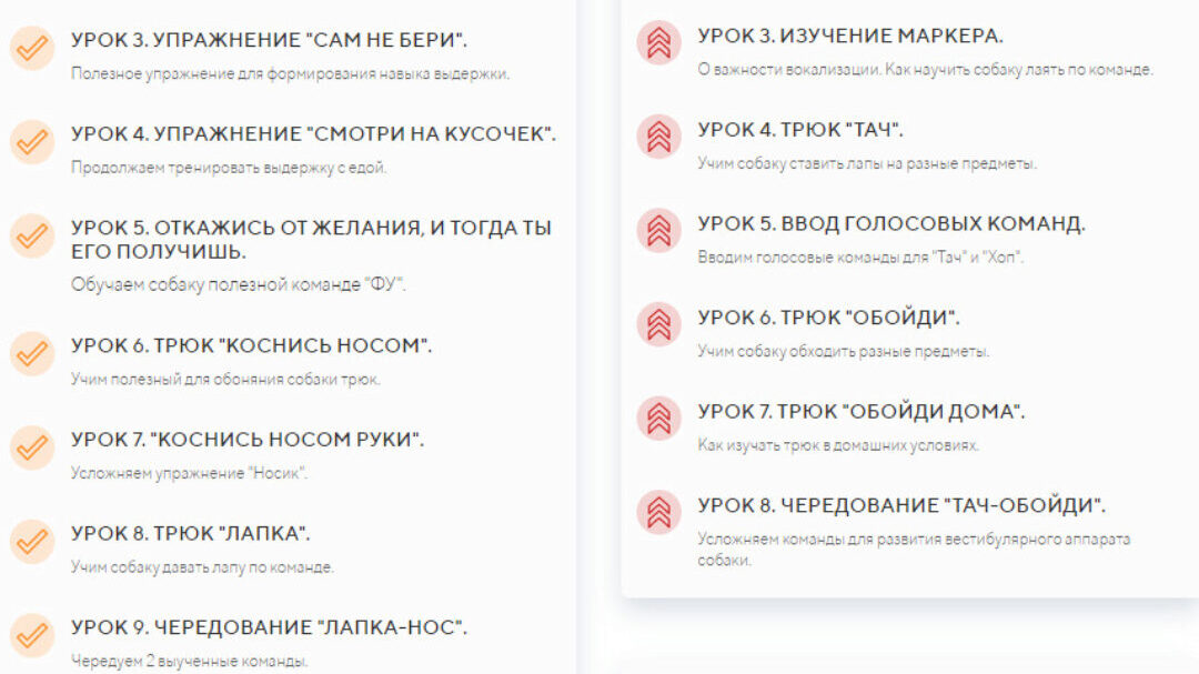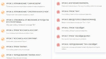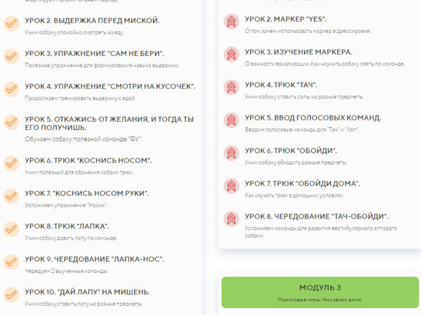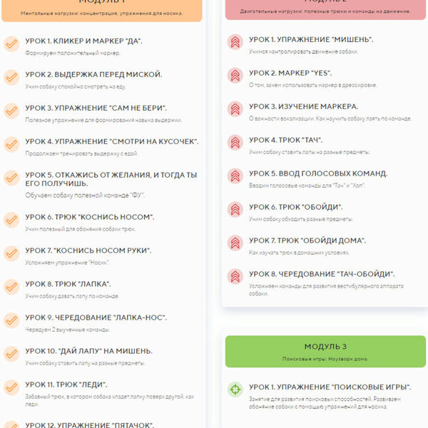 В комплекте 3 модуля: 1 модуль: — Развитие пищевой мотивации. — Упражнение «Липкая собака или Включение». — Упражнение «Мишень» и упражнение «Наведение». — Трюк «Хоп» на наведении. Зачем вообще нужны трюки в обучении. — Прогулка на провисшем поводке. — Упражнение «Дзен»: умение собаки