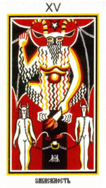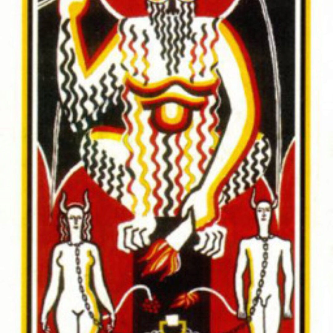 Яхболон (божество Тамплиеров) или Бафомёт. Карта показывает энергии, которыми мы привязаны к этому миру, это энергии Серебряной нити. Князь этого мира – Сатана, так вот он там и нарисован. Мы к этому миру прикованы цепью, которая на этой карте изображена. Сиддха этого аркана – оживление. Тот, кто владеет энергиями этого аркана, тот может вернуть человека в этот мир, восстановить Серебряную нить, воскресить покойника.
